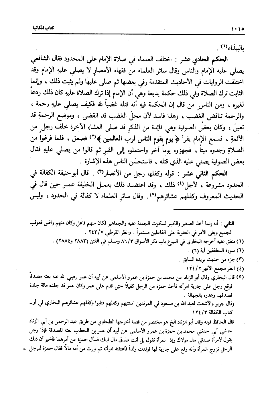 الحكم الثاني عشر: قوله وكفلها رجل من الأنصار (¬3). قال أبو حنيفة الكفالة في الحدود مشروعة، لأجل (¬4) ذلك، وقد اعتضد ذلك بعمل الخليفة عمر حين قال في الحديث المعروف وكفلهم عشائرهم (¬5). وقال سائرِ العلماء لا كفالة في الحدود، وليس