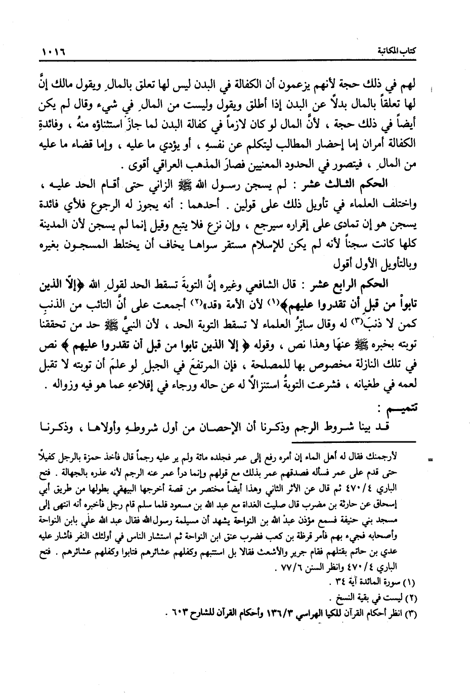 = لأرجمنك فقال له أهل الماء إن أمره رفع إلى عمر فجلده مائة ولم ير عليه رجماً قال فأخذ حمزة بالرجل كفيلاً حتى قدم على عمر فسأله فصدقهم عمر بذلك مع قولهم وإنما درأ عمر عنه الرجم لأنه عذره بالجهالة. فتح الباري 4/ 470 ثم قال عن الأثر الثاني وهذا أيضًا مختصر من قصة أخرجها البيهقي بطولها من طريق أبي إسحاق عن حارثة بن مضرب قال صليت الغداة مع عبد الله بن مسعود فلما سلم قام رجل فأخبره أنه انتهى إلى مسجد بني حنيفة فسمع مؤذن عبد الله بن النواحة يشهد أن مسيلمة رسول الله فقال عبد الله علي بابن النواحة وأصحابه فجيء بهم فأمر قرظة بن كعب فضرب عنق ابن النواحة ثم استشار الناس في أولئك النفر فأشار عليه عدي بن حاتم بقتلهم فقام جرير والأشعث فقالا بل استتبهم وكفلهم عشائرهم فتابوا وكفلهم عشائرهم. فتح الباري 4/ 470 وانظر السنن 6/ 77.