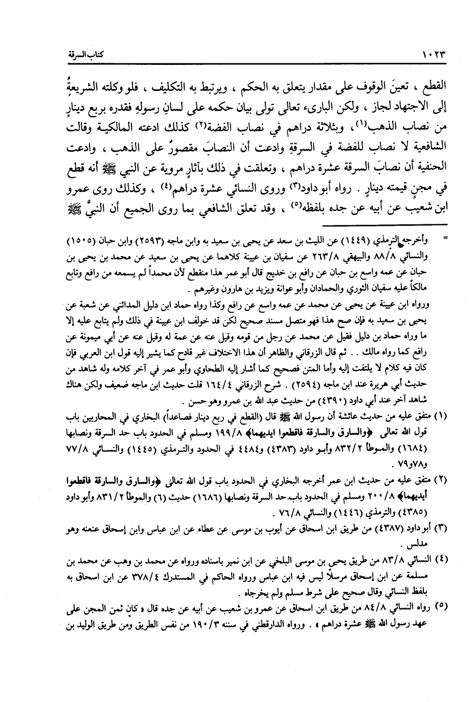 (¬1) متفق عليه من حديث عائشة أن رسول الله قال (القطع في ربع دينار فصاعداً) البخاري في المحاربين باب قول الله تعالى {وَالسَّارِقُ وَالسَّارِقَةُ فَاقْطَعُوا أَيْدِيَهُمَا} 8/ 199 ومسلم في الحدود باب حد السرقة ونصابها (1684) والموطا 2/ 832 وأبو داود (4383) و 4484 في الحدود والترمذي (1445) والنسائي 8/ 77 و 78 و 79.