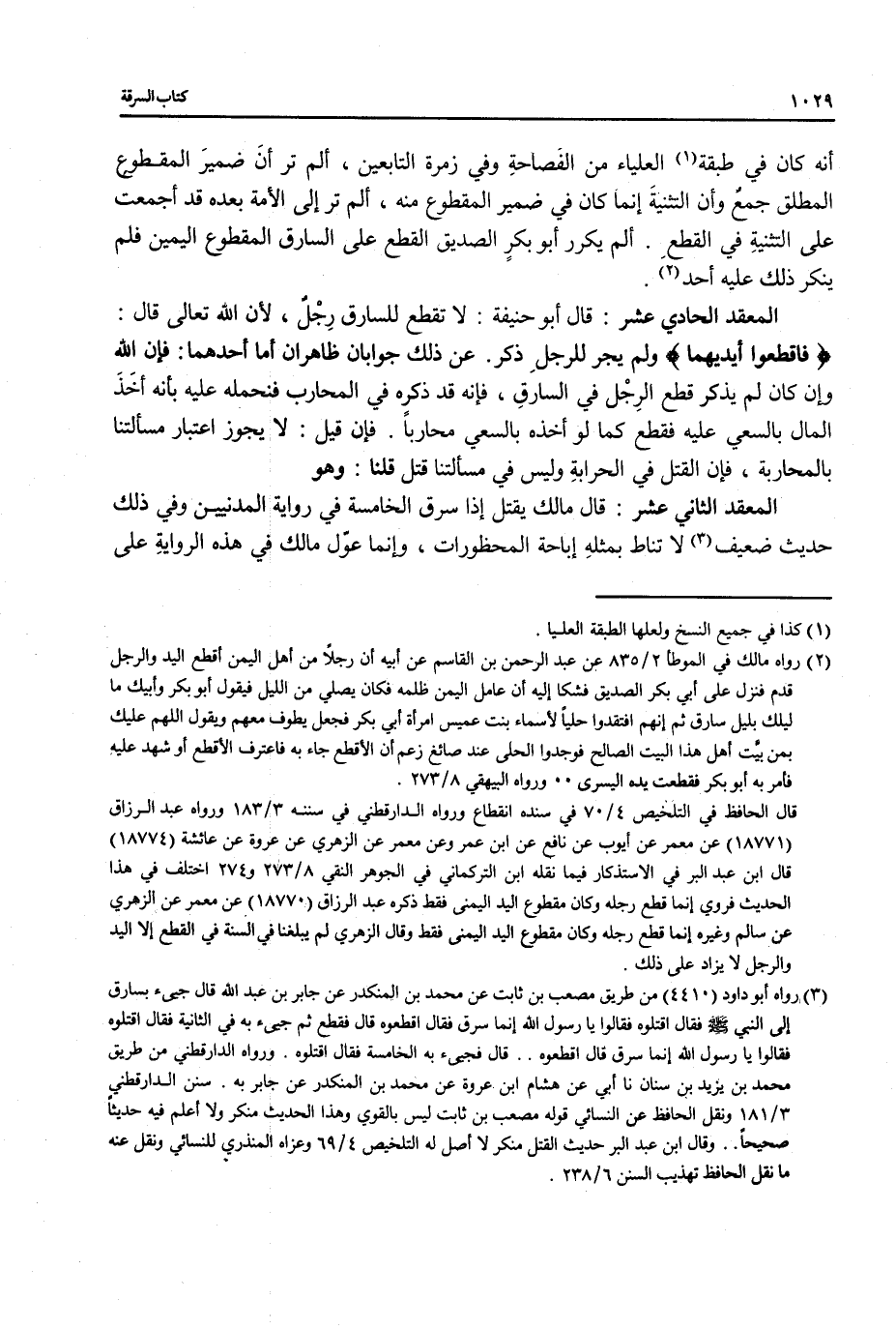 المعقد الحادي عشر: قال أبو حنيفة: لا تقطع للسارق رِجْلٌ، لأن الله تعالى قال: {فاقطعوا أيديهما} ولم يجر للرجلِ ذكر. عن ذلك جوابان ظاهران أما أحدهما: فإن الله وإن كان لم يذكر قطع الرِجْل في السارقِ، فإنه قد ذكرِه في المحارب فنحمله عليه بأنه أخَذَ المال بالسعي عليه فقطع كما لو أخذه بالسعي محارباً. فإن قيل: لا يجوز اعتبار مسألتنا بالمحاربة، فإن القتل في الحرابةِ وليس في مسألتنا قتل قلنا: وهو