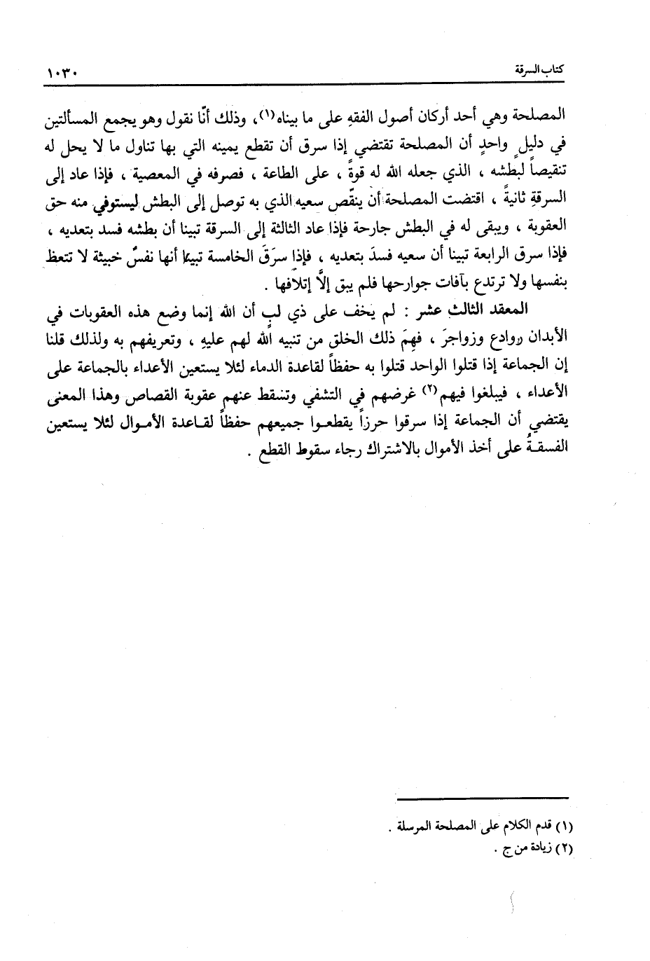 المصلحة وهي أحد أركان أصول الفقهِ على ما بيناه (¬1)، وذلك أنّا نقول وهو يجمع المسألتين في دليلٍ واحدٍ أن المصلحة تقتضي إذا سرق أن تقطع يمينه التي بها تناول ما لا يحل له تنقيصاً لبطشه، الذي جعله الله له قوةً، على الطاعة، فصرفه في المعصية، فإذا عاد إلى السرقةِ ثانيةً، اقتضت المصلحة أن ينقّص سعيه الذي به توصل إلى البطش ليستوفي منه حق العقوبة، ويبقى له في البطش جارحة فإذا عاد الثالثة إلى السرقة تبينا أن بطشه فسد بتعديه، فإذا سرق الرابعة تبينا أن سعيه فسدَ بتعديه، فإذا سرَقَ الخامسة تبينا أنها نفسٌ خبيثة لا تتعظ بنفسها ولا ترتدع بآفات جوارحها فلم يبق إلَّا إتلافها.