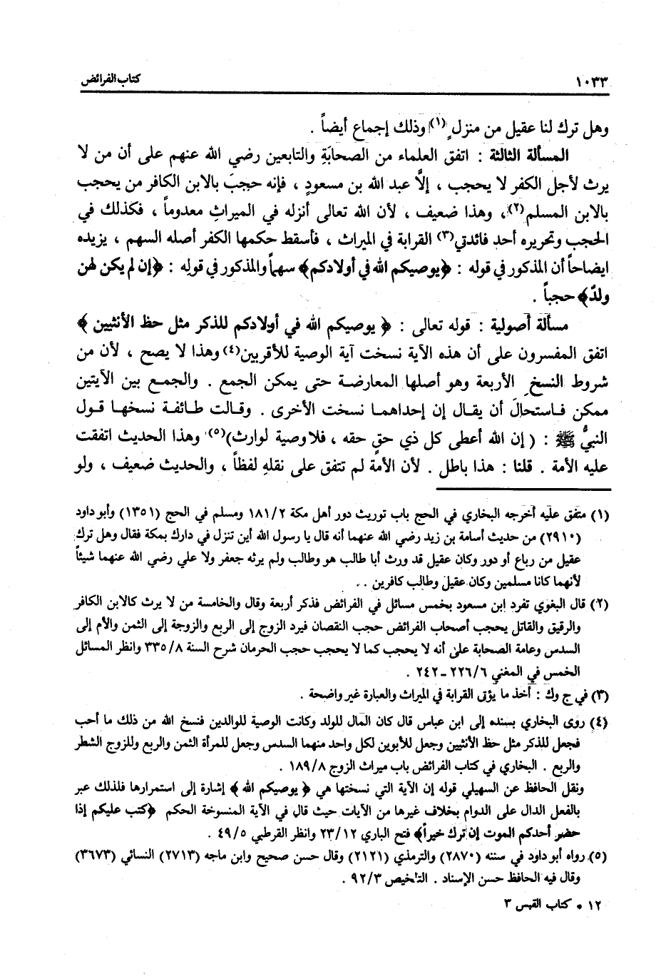 (¬2) قال البغوي تفرد ابن مسعود بخمس مسائل في الفرائض فذكر أربعة وقال والخامسة من لا يرث كالابن الكافر والرقيق والقاتل يحجب أصحاب الفرائض حجب النقصان فيرد الزوج إلى الربع والزوجة إلى الثمن والأم إلى السدس وعامة الصحابة على أنه لا يحجب كما لا يحجب حجب الحرمان شرح السنة 8/ 335 وانظر المسائل الخمس في المغني 6/ 226 - 242.