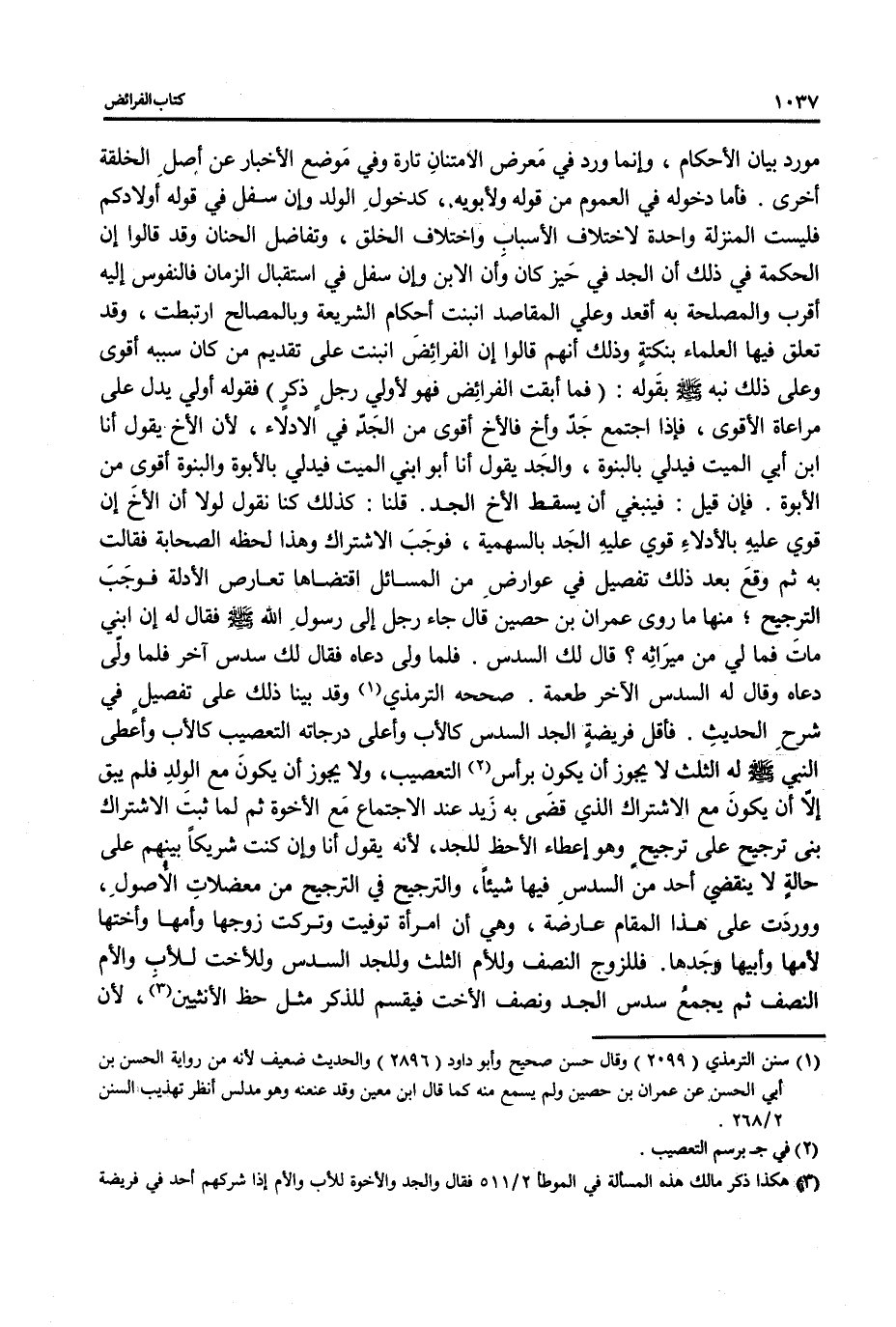 مورد بيان الأحكام، وإنما ورد في مَعرض الامتنانِ تارة وفي مَوضع الأخبار عن أصِلِ الخلقة أخرى. فأما دخوله في العموم من قوله ولأبويه، كدخولِ الولد وإن سفل في قوله أولادكم فليست المنزلة واحدة لاختلاف الأسباب واختلاف الخلق، وتفاضل الحنان وقد قالوا إن الحكمة في ذلك أن الجد في حَيز كان وَأن الابن وإن سفل في استقبال الزمان فالنفوس إليه أقرب والمصلحة به أقعد وعلي المقاصد انبنت أحكام الشريعة وبالمصالح ارتبطت، وقد تعلق فيها العلماء بنكتةٍ وذلك أنهم قالوا إن الفرائِضَ انبنت على تقديم من كان سببه أقوى وعلى ذلك نبه - صلى الله عليه وسلم - بقَوله: (فما أبقت الفرائِض فهو لأولي رجلٍ ذكرٍ) فقوله أولي يدل على مراعاة الأقوى، فإذا اجتمع جَدّ وأخ فالأخ أقوى من الجَدّ في الادلاء، لأن الأخ يقول أنا ابن أبي الميت فيدلي بالبنوة، والجَد يقول أنا أبو ابني الميت فيدلي بالأبوة والبنوة أقوى من الأبوة. فإن قيل: فينبغي أن يسقط الأخ الجد. قلنا: كذلك كنا نقول لولا أن الأخَ إن قوي عليهِ بالأدلاءِ قوي عليهِ الجَد بالسهمية، فوجَبَ الاشتراك وهذا لحظه الصحابة فقالت به ثم وقعَ بعد ذلك تفصيل في عوارضِ من المسائل اقتضاها تعارص الأدلة فوجَبَ الترِجيح؛ منها ما روى عمران بن حصين قال جاء رجل إلى رسولِ الله - صلى الله عليه وسلم - فقال له إن ابني مات فما لي من ميرَاثِه؟ قال لك السدس. فلما ولى دعاه فقال لك سدس آخر فلما ولّى دعاه وقال له السدس الآخر طعمة. صححه الترمذي (¬1) وقد بينا ذلك على تفصيلٍ في شرحِ الحديثِ. فأقل فريضةٍ الجد السدس كالأب وأعلى درجاته التعصيب كالأب وأعطى النبي - صلى الله عليه وسلم - له الثلث لا يجوز أن يكون برأس (¬2) التعصيب، ولا يجوز أن يكونَ مع الولدِ فلم يبق إلَّا أن يكونَ مع الاشتراك الذي قضَى به زَيد عند الاجتماع مَع الأخوة ثم لما ثبتَ الاشتراك بني ترجيح على ترجيحٍ وهو إعطاء الأحظ للجد، لأنه يقول أنا وإن كنت شريكاً بينهم على حالةٍ لا ينقضي أحد من السدسِ فيها شيئاً، والترجيح في الترجيح من معضلاتِ الأُصولِ، ووردَت على هذا المقام عارضة، وهي أن امرأة توفيت وتركت زوجها وأمها وأختها لأمها وأبيها وجَدها. فللزوج النصف وللأم الثلث وللجد السدس وللأخت للأبِ والأم النصف ثم يجمعُ سدس الجد ونصف الأخت فيقسم للذكر مثل حظ الأنثين (¬3)، لأن