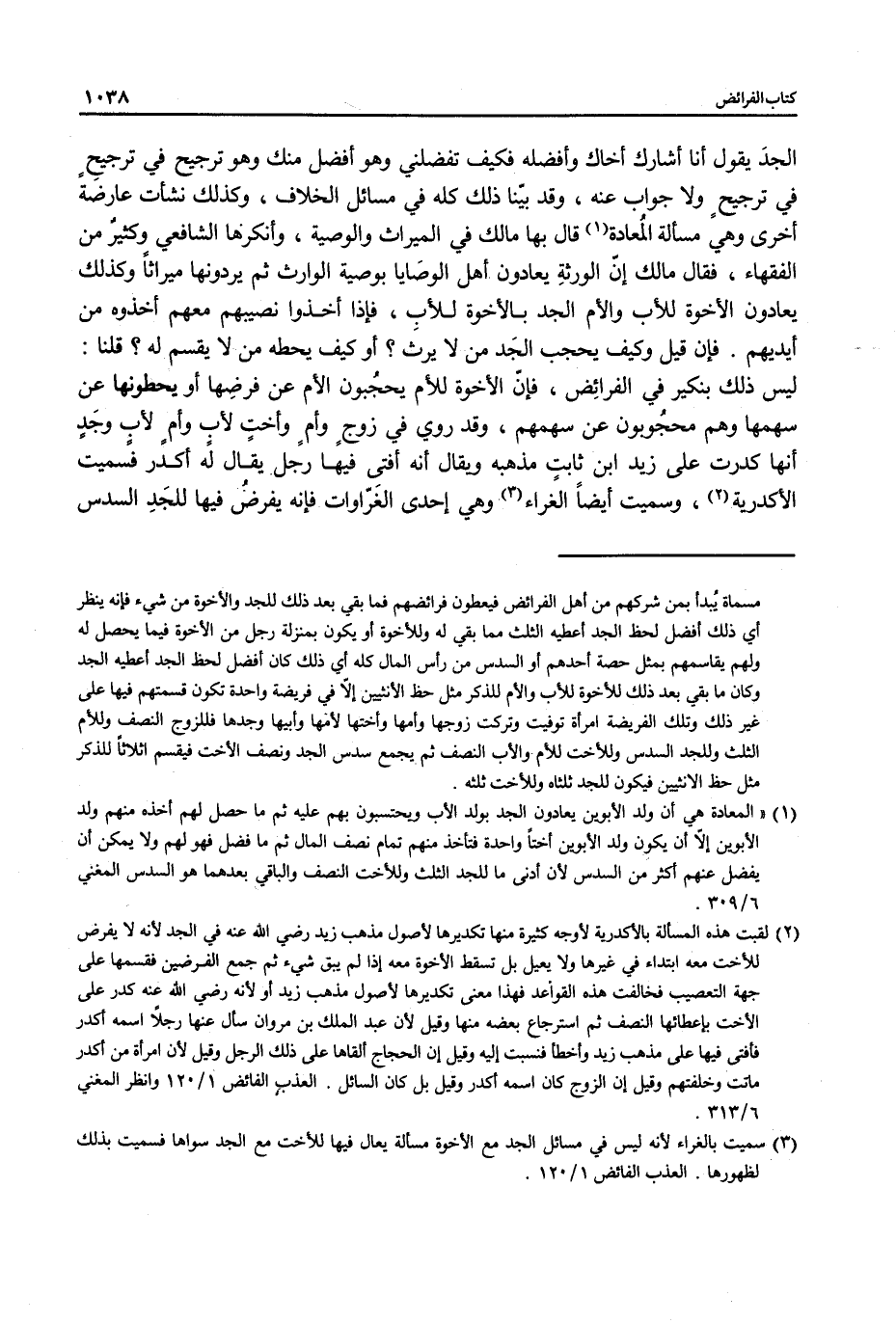 الجدَ يقول أنا أشارك أخاك وأفضله فكيف تفضلني وهو أفضل منك وهو ترجيح في ترجيحِ في ترجيحٍ ولا جواب عنه، وقد بيّنا ذلك كله في مسائل الخلاف، وكذلك نشأت عارضة أخرى وهي مسألة المُعادة (¬1) قال بها مالك في الميراث والوصية، وأنكرها الشافعي وكثيرٌ من الفقهاء، فقال مالك إنّ الورثةِ يعادون أهل الوصَايا بوصية الوارث ثم يردونها ميراثًا وكذلك يعادون الأخوة للأب والأم الجد بالأخوة للأب، فإذا أخذوا نصيبهم معهم أخذوه من أيديهم. فإن قيل وكيف يحجب الجَد من لا يرثَ؟ أوكيف يحطه من لا يقسم له؟ قلنا: ليس ذلك بنكير في الفرائِض، فإن الأخوة للأم يحجُبون الأم عن فرضِها أو يحطونها عن سهمها وهم محجُوبون عن سهمهم، وقد روي في زوجٍ وأمٍ وأختٍ لأبٍ وأمٍ لأبٍ وجَدٍ أنها كدرت على زيد ابن ثابتٍ مذهبه ويقال أنه أفتى فيها رجل يقال له أكدر فسميت الأكدرية (¬2)، وسميت أيضاً الغراء (¬3) وهي إحدى الغَراوات فإنه يفرضُ فيها للجَدِ السدس