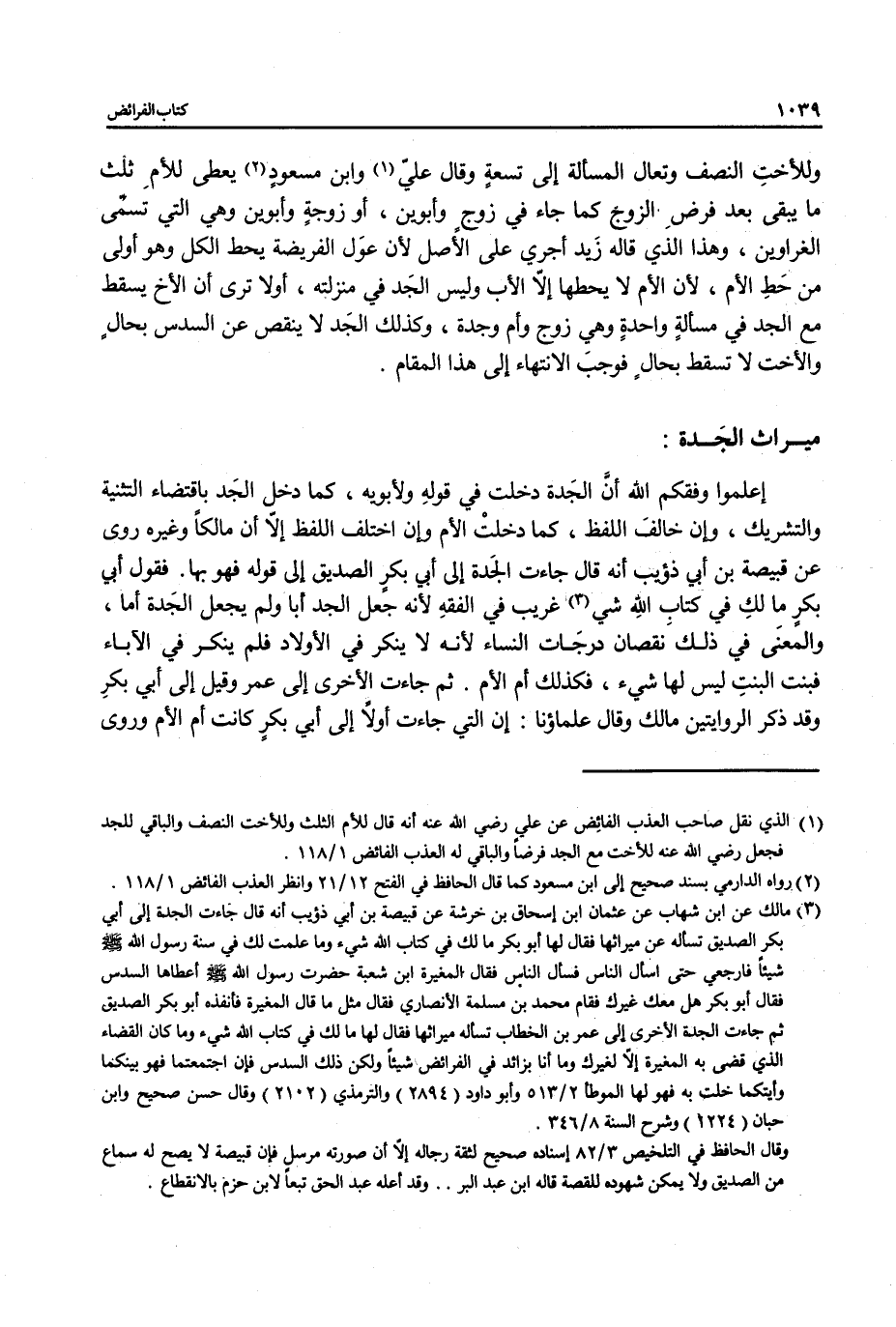 (¬3) مالك عن ابن شهاب عن عثمان ابن إسحاق بن خرشة عن قبيصة بن أبي ذؤيب أنه قال جاءت الجدة إلى أبي بكر الصديق تسأله عن ميراثها فقال لها أبو بكر مالك في كتاب الله شيء وما علمت لك في سنة رسول الله - صلى الله عليه وسلم - شيئًا فارجعي حتى اسأل الناس فسأل الناس فقال المغيرة ابن شعبة حضرت رسول الله - صلى الله عليه وسلم - أعطاها السدس فقال أبو بكر هل معك غيرك فقام محمَّد بن مسلمة الأنصاري فقال مثل ما قال المغيرة فأنفذه أبو بكر الصديق ثم جاءت الجدة الأخرى إلي عمر بن الخطاب تسأله ميراثها فقال لها مالك في كتاب الله شيء وما كان القضاء الذي قضى به المغيرة إلَّا لغيرك وما أنا بزائد في الفرائض شيئًا ولكن ذلك السدس فإن اجتمعتما فهو بينكما وأيتكما خلت به فهو لها الموطأ 2/ 513 وأبو داود (2894) والترمذي (2102) وقال حسن صحيح وابن حبان (1224) وشرح السنة 8/ 346.