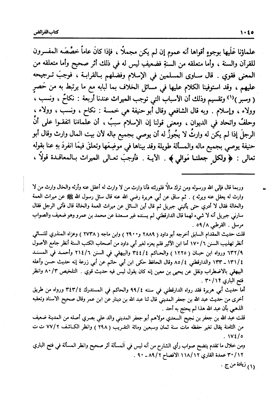 علماؤنا عَلَيها بوجوهٍ أقواها أنه عموم إن لم يكن مجملاً، فإذا كانَ عاماً خصَّصَه المفسرون للقرآن والسنة، وأما متعلقه من السنةِ فضعيف ليس له في ذلك أثر صحيح وأما متعلقه من المعنى فقوي. قال ساوى المسلمين في الإِسلام وفضلهم بالقرابة، فوجبَ ترجيحه عليهم، وقد استوفينا الكلام عليها في مسائل الخلاف بما لبابه مع ما يرتبط به من حَصرٍ (وسبر) (¬1) وتقسيم وذلك أن الأسباب التي توجب الميراث عندنا أربعة: نكاحٌ، ونسب، وولاء، وإسلام. وبه قال الشافعي وقال أبو حنيفة هي خمسة: نكاح، ونسب، وولاء، وحلفٌ واتحاد في الديوان، ومعنى قولنا ان الإِسلام سببٌ، أن علماءَنا اتفقوا على أنَّ الرجلَ إذا لم يكن له وارث لا يجُوزُ له أن يوصي بجميع ماله لأن بيت المال وارث وقال أبو حنيفة يوصي بجميع ماله والمسألة طويلة وقد بيناها في موضِعَها وتعلقَ فيمَا انفردَ بهِ عنا بقوله تعالى: {وَلِكُلٍّ جَعَلْنَا مَوَالِيَ}. الآية. فأوجبَ تعالى الميراث بالمعاقدة قولاً،