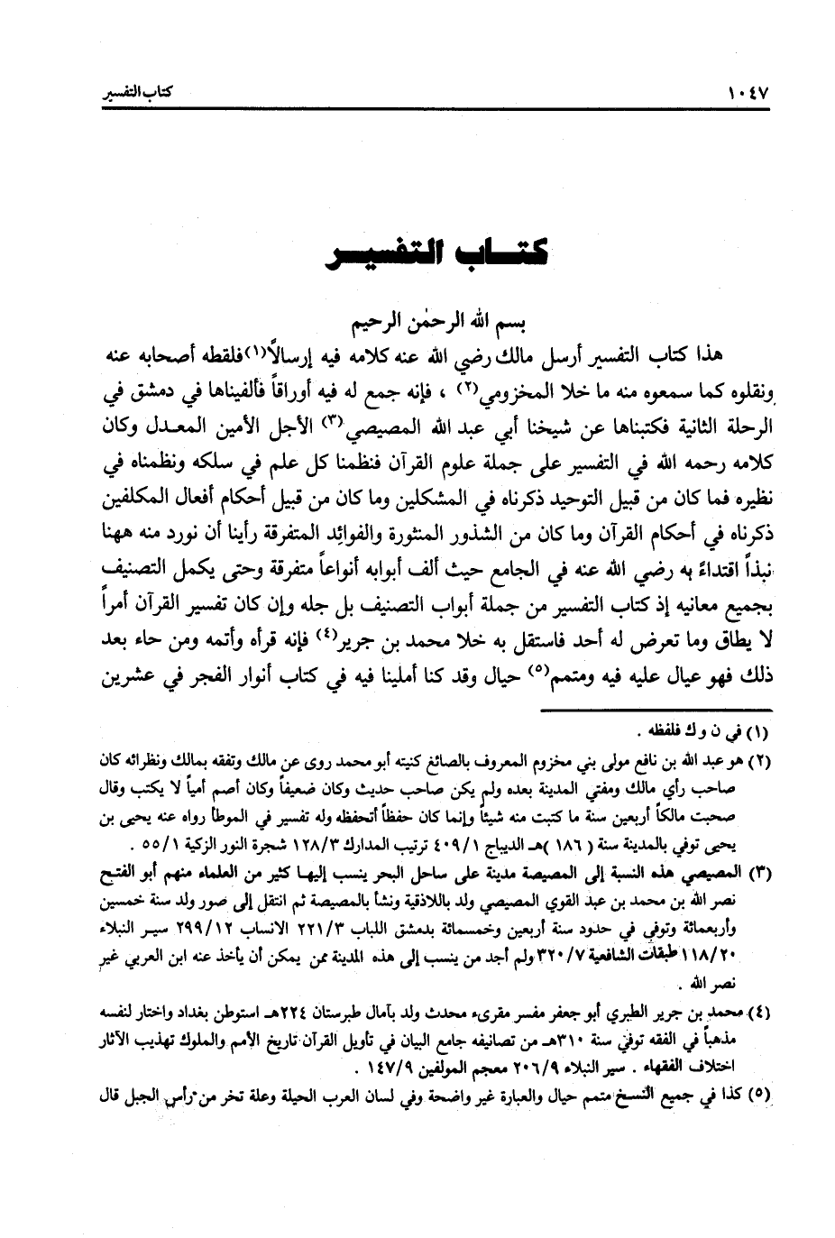 هذا كتاب التفسير أرسل مالك رضي الله عنه كلامه فيه إرسالاً (¬1) فلقطه أصحابه عنه ونقلوه كما سمعوه منه ما خلا المخزومي (¬2)، فإنه جمع له فيه أوراقاً فألفيناها في دمشق في الرحلة الثانية فكتبناها عن شيخنا أبي عبد الله المصيصي (¬3) الأجل الأمين المعدل وكان كلامه رحمه الله في التفسير على جملة علوم القرآن فنظمنا كل علم في سلكه ونظمناه في نظيره فما كان من قبيل التوحيد ذكرناه في المشكلين وما كان من قبيل أحكام أفعال المكلفين ذكرناه في أحكام القرآن وما كان من الشذور المنثورة والفوائِد المتفرقة رأينا أن نورد منه ها هنا نبذاً اقتداءً به رضي الله عنه في الجامع حيث ألف أبوابه أنواعاً متفرقة وحتى يكمل التصنيف بجميع معانيه إذ كتاب التفسير من جملة أبواب التصنيف بل جله وإن كان تفسير القرآن أمراً لا يطاق وما تعرض له أحد فاستقل به خلا محمَّد بن جرير (¬4) فإنه قرأه وأتمه ومن جاء بعد ذلك فهو عيال عليه فيه ومتمم (¬5) حيال وقد كنا أملينا فيه في كتاب أنوار الفجر في عشرين