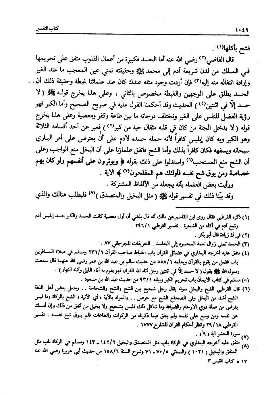 قال القاضي (¬2) رضي الله عنه أما الحسد فكبيرة من أعمال القلوب متفق على تحريمها في الملك من لدن شريعة آدم إلى محمَّد - صلى الله عليه وسلم - وحقيقته تمني عين المعجب ما عند الغير وإرادة انتقاله منه إليه (¬3) فإن أردت وجود مثله عندك كان عند علمائنا غبطة وحقيقة ذلك أن الحسد يطلق على الوجهين والغبطة مخصوص بالثاني، وعلى هذا يخرج قوله - صلى الله عليه وسلم - (لا حسد إلَّا في اثنتين (¬4)) الحديث وقد أحكمنا القول عليه في صريح الصحيح وأما الكبر فهو رؤية الفضل للنفس على الغير وتختلف درجاته ما بين طاعة وكفر ومعصية وعلى هذا يخرج قوله (لا يدخل الجنة من كان في قلبه مثقال حبَّة من كبر (¬5)) فعبر عن أحد أقسامه الثلاثة وهو الكبر وبه كان إبليس كافراً لأنه حمله حسده لآدم على أن يعترض على أمر الباري سبحانه ويسفهه فكان كافراً بذلك وأما الشح فاتفق علماؤنا على أن البخل منع الواجب وعلى أن الشح منع المستحب (¬6) واستدلوا على ذلك بقوله {وَيُؤْثِرُونَ عَلَى أَنْفُسِهِمْ وَلَوْ كَانَ بِهِمْ خَصَاصَةٌ وَمَنْ يُوقَ شُحَّ نَفْسِهِ فَأُولَئِكَ هُمُ الْمُفْلِحُونَ (¬7)} الآية.