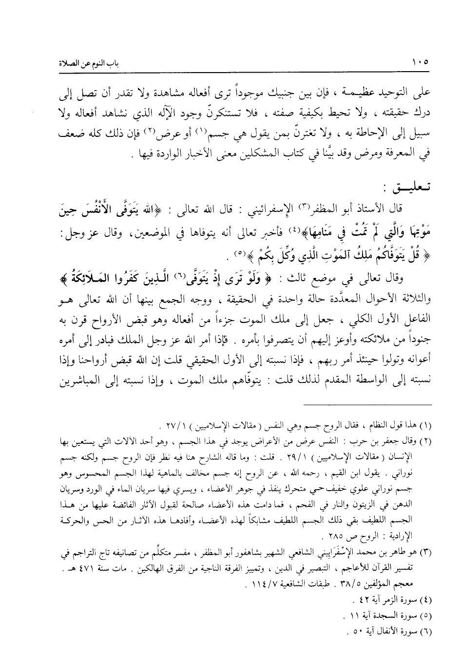 قال الأستاذ أبو المظفر (¬3) الإِسفرائيني: قال الله تعانى: {اللَّهُ يَتَوَفَّى الْأَنْفُسَ حِينَ مَوْتِهَا وَالَّتِي لَمْ تَمُتْ فِي مَنَامِهَا} (¬4) فأخبر تعالى أنه يتوفاها في الوضعين، وقال عز وجل: {قُلْ يَتَوَفَّاكُمْ مَلَكُ الْمَوْتِ الَّذِي وُكِّلَ بِكُمْ} (¬5).