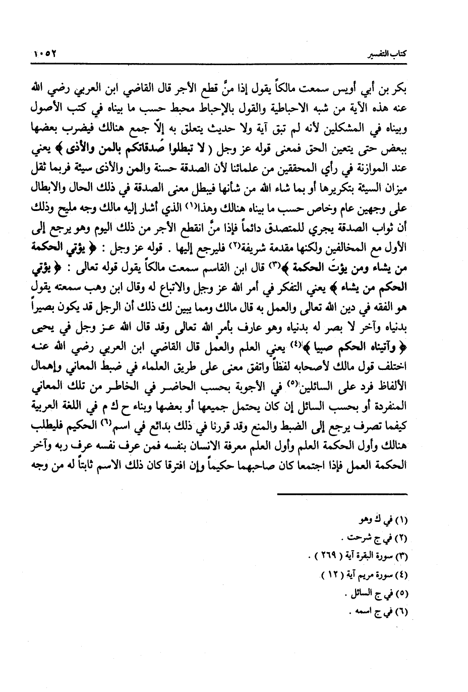 بكر بن أبي أويس سمعت مالكاً يقول إذا منَّ قطع الأجر قال القاضي ابن العربي رضي الله عنه هذه الآية من شبه الاحباطية والقول بالإحباط محبط حسب ما بيناه في كتب الأصول وبيناه في المشكلين لأنه لم تبق آية ولا حديث يتعلق به إلَّا جمع هنالك فيضرب بعضها ببعض حتى يتعين الحق فمعنى قوله عَزَّ وَجَلَّ {لَا تُبْطِلُوا صَدَقَاتِكُمْ بِالْمَنِّ وَالْأَذَى} يعني عند الموازنة في رأي المحققين من علمائنا لأن الصدقة حسنة والمن والأذى سيئة فربما ثقل ميزان السيئة بتكريرها أو بما شاء الله من شأنها فيبطل معنى الصدقة في ذلك الحال والابطال على وجهين عام وخاص حسب ما بيناه هنالك وهذا (¬1) الذي أشار إليه مالك وجه مليح وذلك أن ثواب الصدقة يجري للمتصدق دائماً فإذا منَّ انقطع الأجر من ذلك اليوم وهو يرجع إلى الأول مع المخالفين ولكنها مقدمة شريفة (¬2) فليرجع إليها. قوله عز وجل: {يُؤْتِي الْحِكْمَةَ مَنْ يَشَاءُ وَمَنْ يُؤْتَ الْحِكْمَةَ} (¬3) قال ابن القاسم سمعت مالكاً يقول قوله تعالى: {يُؤْتِي الْحِكْمَةَ مَنْ يَشَاءُ} يعني التفكر في أمر الله عَزَّ وَجَلَّ والاتباع له وقال ابن وهب سمعته يقول هو الفقه في دين الله تعالى والعمل به قال مالك ومما يبين لك ذلك أن الرجل قد يكون بصيراً بدنياه وآخر لا بصر له بدنياه وهو عارف بأمر الله تعالى وقد قال الله عَزَّ وَجَلَّ في يحيى {وَآتَيْنَاهُ الْحُكْمَ صَبِيًّا} (¬4) يعني العلم والعمل قال القاضي ابن العربي رضي الله عنه اختلف قول مالك لأصحابه لفظًا واتفق معنى على طريق العلماء في ضبط المعاني وإهمال الألفاظ فرد على السائلين (¬5) في الأجوبة بحسب الحاضر في الخاطر من تلك المعاني المنفردة أو بحسب السائل إن كان يحتمل جميعها أو بعضها وبناء ح ك م في اللغة العربية كيفما تصرف يرجع إلى الضبط والمنع وقد قررنا في ذلك بدائع في اسم (¬6) الحكيم فليطلب هنالك وأول الحكمة العلم وأول العلم معرفة الانسان بنفسه فمن عرف نفسه عرف ربه وآخر الحكمة العمل فإذا اجتمعا كان صاحبهما حكيماً وإن افترقا كان ذلك الاسم ثابتًا له من وجه