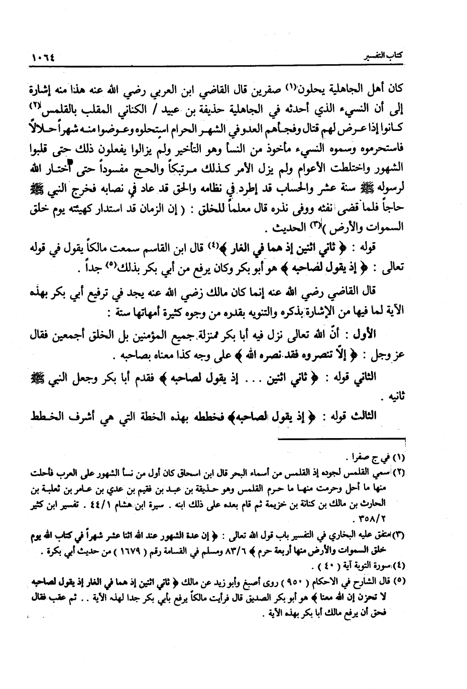 (¬5) قال الشارح في الأحكام (950) روى أصبغ وأبو زيد عن مالك {ثَانِيَ اثْنَيْنِ إِذْ هُمَا فِي الْغَارِ إِذْ يَقُولُ لِصَاحِبِهِ لَا تَحْزَنْ إِنَّ اللَّهَ مَعَنَا} هو أبو بكر الصديق قال فرأيت مالكاً يرفع بأبي بكر جداً لهذه الآية .. ثم عقب فقال فحق أن يرفع مالك أبا بكر بهذه الآية.