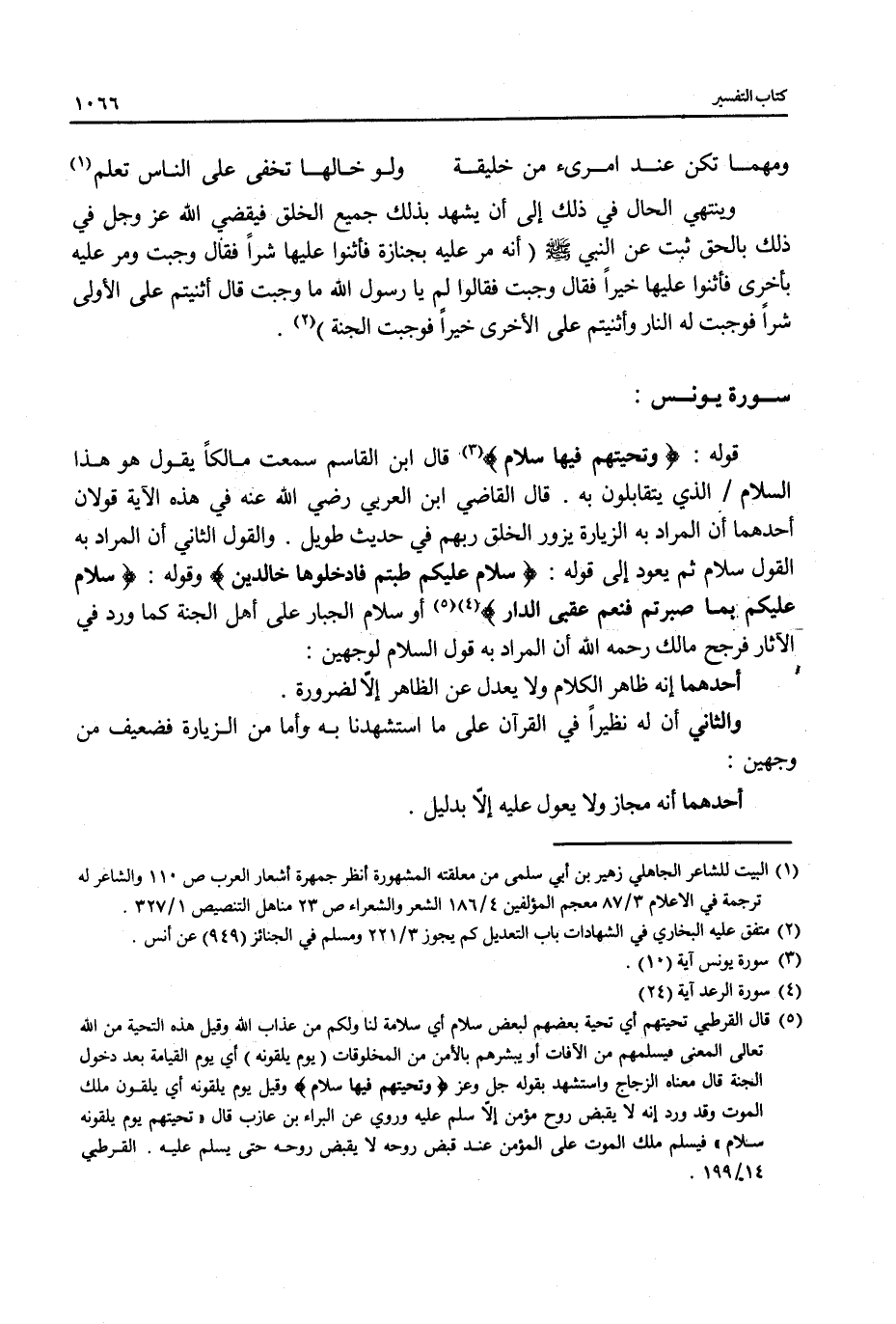 قوله: {وَتَحِيَّتُهُمْ فِيهَا سَلَامٌ} (¬3) قال ابن القاسم سمعت مالكاً يقول هو هذا السلام الذي يتقابلون به. قال القاضي ابن العربي رضي الله عنه في هذه الآية قولان أحدهما أن المراد به الزيارة يزور الخلق ربهم في حديث طويل. والقول الثاني أن المراد به القول سلام ثم يعود إلى قوله: {سَلَامٌ عَلَيْكُمْ طِبْتُمْ فَادْخُلُوهَا خَالِدِينَ} وقوله: {سَلَامٌ عَلَيْكُمْ بِمَا صَبَرْتُمْ فَنِعْمَ عُقْبَى الدَّارِ} (¬4) (¬5) أو سلام الجبار على أهل الجنة كما ورد في الآثار فرجح مالك رحمه الله أن المراد به قول السلام لوجهين: