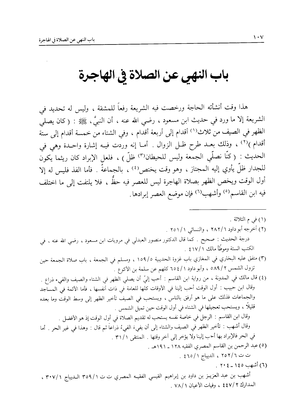 هذا وقت أنشأته الحاجة ورخصت فيه الشريعة رفعاً للمشقة، وليس له تحديد في الشريعة إلا ما ورد في حديث ابن مسعود، رضي الله عنه، أن النبيَّ، - صلى الله عليه وسلم -: (كان يصلي الظهر في الصيف من ثلاث (¬1) أقدام إلى أربعة أقدام، وفي الشتاء من خمسة أقدام إلى ستة أقدام) (¬2)، وذلك بعد طرح ظل الزوال. أما إنه وردت فيه إشارة واحدة وهي في الحديث: (كنّا نصلّي الجمعة وليس للحيطان (¬3) ظلّ)، فلعل الإبراد كان ريثما يكون للجدار ظلّ يأوى إليه المجتاز، وهو وقت يختص (¬4)، بالجماعةٌ. فأما الفذ فليس له إلا أول الوقت ويخص الظهر بصلاة الهاجرة ليس للعصر فيه حظٌّ، فلا يلتفت إلى ما اختلف فيه ابن القاسم (¬5) وأشهب (¬6) فإن موضع العصر إبرادها.