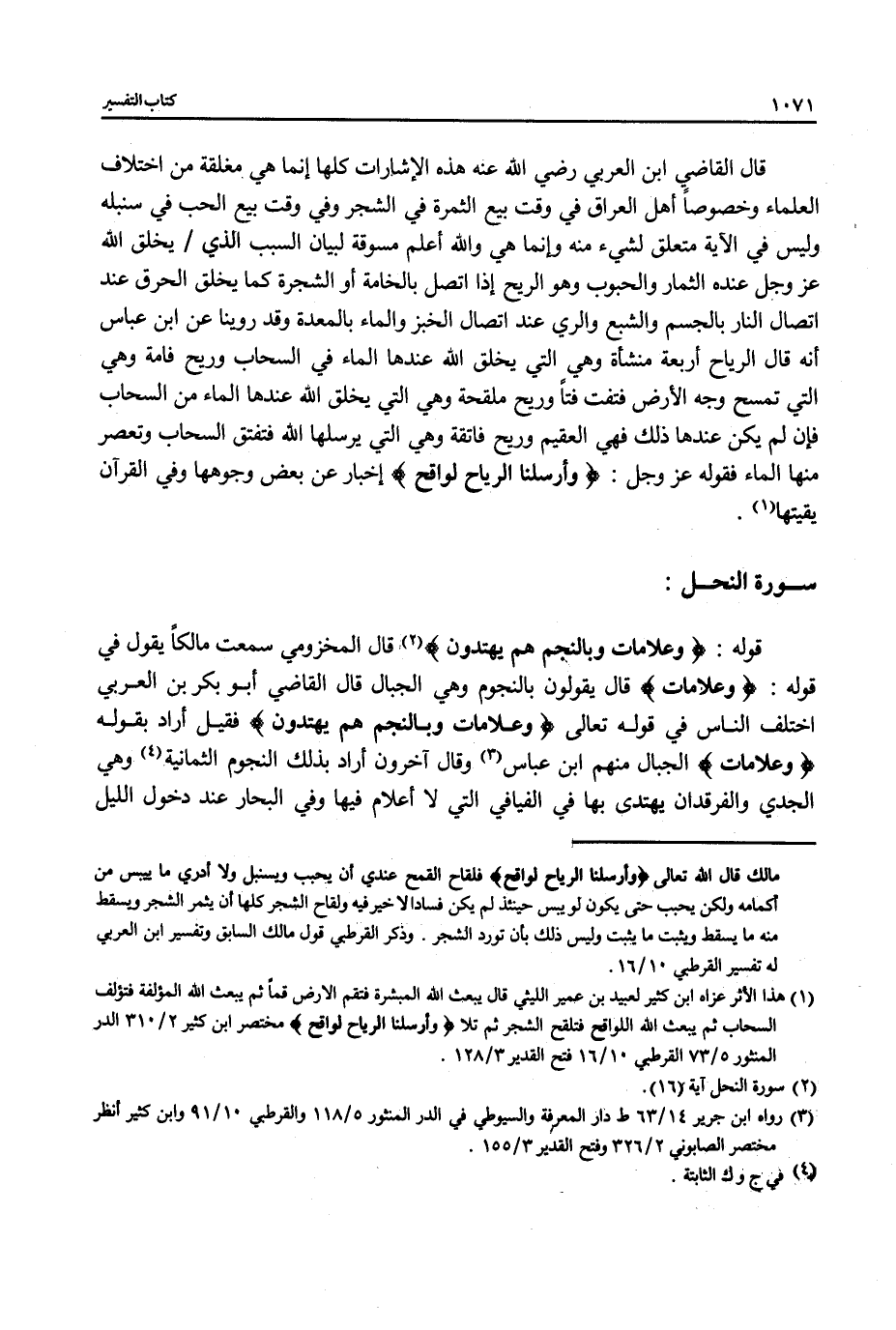 قوله: {وَعَلَامَاتٍ وَبِالنَّجْمِ هُمْ يَهْتَدُونَ} (¬2): قال المخزومي سمعت مالكاً يقول في قوله: {وَعَلَامَاتٍ} قال يقولون بالنجوم وهي الجبال قال القاضي أبو بكر بن العربي اختلف الناس في قوله تعالى {وَعَلَامَاتٍ وَبِالنَّجْمِ هُمْ يَهْتَدُونَ} فقيل أراد بقوله {وَعَلَامَاتٍ} الجبال منهم ابن عباس (¬3) وقال آخرون أراد بذلك النجوم الثمانية (¬4) وهي الجدي والفرقدان يهتدى بها في الفيافي التي لا أعلام فيها وفي البحار عند دخول الليل