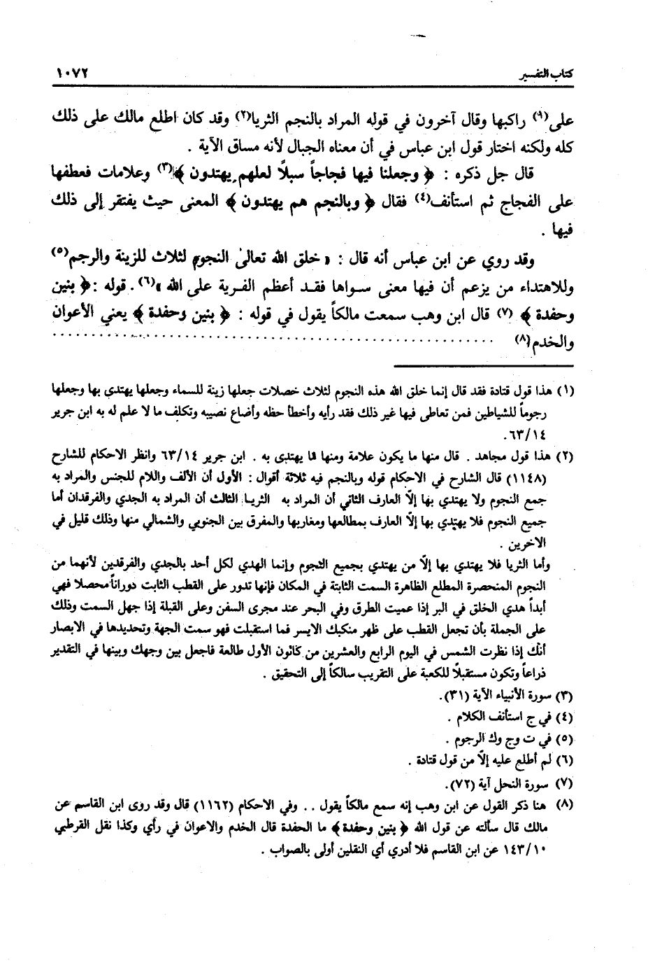 (¬2) هذا قول مجاهد. قال منها ما يكون علامة ومنها ما يهتدى به. ابن جرير 14/ 63 وانظر الاحكام للشارح (1148) قال الشارح في الاحكام قوله وبالنجم فيه ثلاثة أقول: الأول أن الألف واللام للجنس والمراد به جمع النجوم ولا يهتدي بها إلّا العارف الثاني أن المراد به الثريا الثالث أن المرد به الجدي والفرقدان أما جميع النجم فلا يهتدي بها إلّا العارف بمطالعها ومغاربها والمفرق بين الجنوبي والشمالي منها وذلك قيل فهي الآخرين.