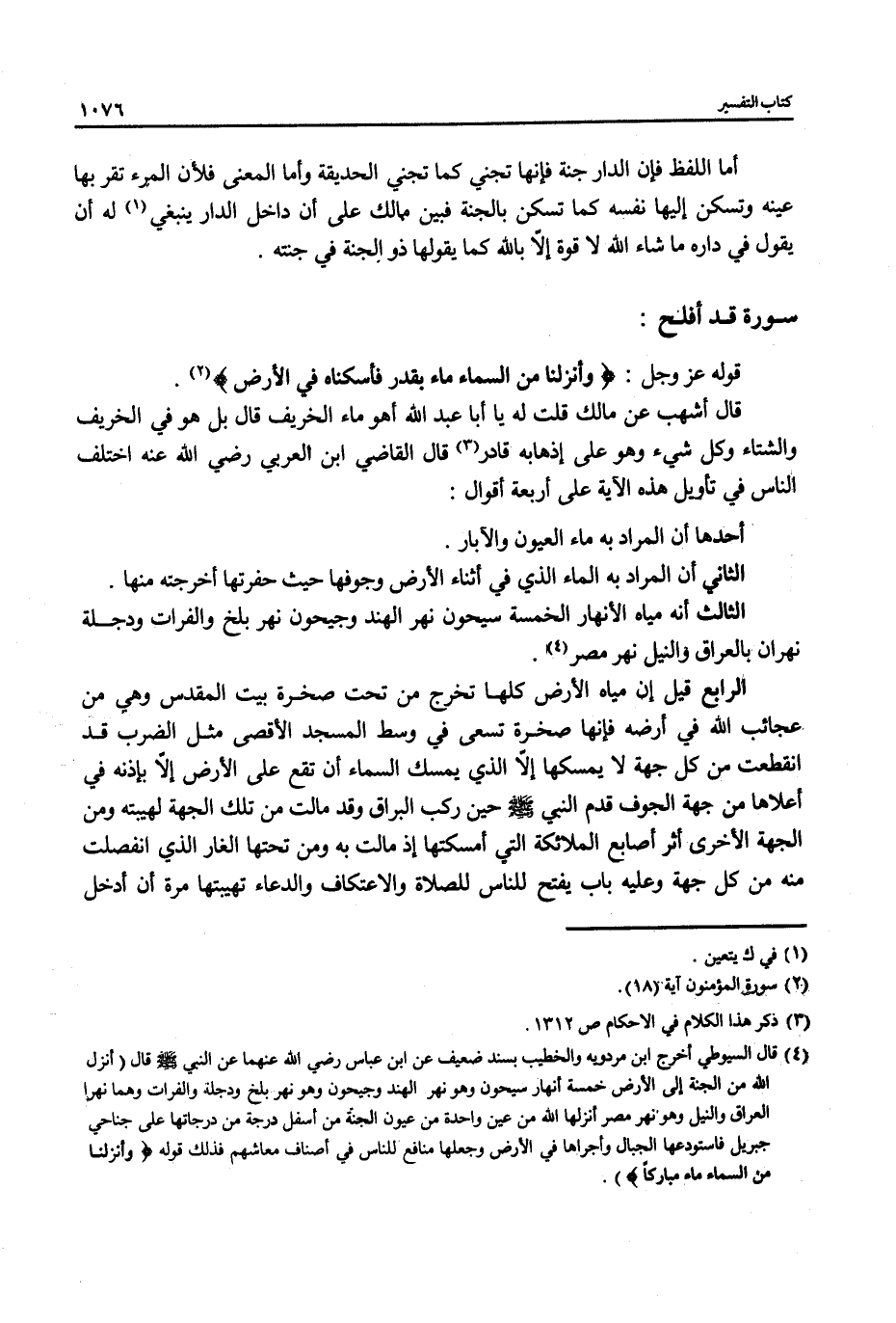 (¬4) قال السيوطي أخرج ابن مردويه والخطيب بسند ضعيف عن ابن عباس رضي الله عنهما عن النبي - صلى الله عليه وسلم - قال (أنزل الله من الجنة إلى الأرض خمسة أنهار سيحون وهو نهر الهند وجيحون وهو نهر بلخ ودجلة والفرات وهما نهرا العراق والنيل وهو نهر مصر أنزلها الله من عين واحدة من عيون الجنة من أسفل درجة من درجاتها على نجاحي جبريل فاستودعها الجبال وأجراها في الأرض وجعلها منافع للناس في أصناف معاشهم فذلك قوله {وَنَزَّلْنَا مِنَ السَّمَاءِ مَاءً مُبَارَكًا}).