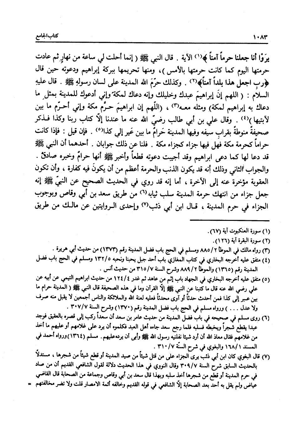 يَرَوْا أَنَّا جَعَلْنَا حَرَمًا آمِنًا} (¬1) الآية. قال النبي - صلى الله عليه وسلم - (إنما أحلت لي ساعة من نهارٍ ثم عادت حرمتها اليوم كما كانت حرمتها بالأمس)، ومنها تحريمها ببركة إبراهيم ودعوته حين قال {رَبِّ اجْعَلْ هَذَا بَلَدًا آمِنًا} (¬2). وكذلك حرّمَ الله المدينة على لسان رسولهِ - صلى الله عليه وسلم -. قال عليهِ السلاَم: (اللهم إنَّ إبراهيمَ عبدك وخليلك وإنه دعاك لمكة وإني أدعوك للمدينة بمثلِ ما دعاك به إبراهيم لمكة) ومثله معه (¬3)، (اللهم إن ابراهيمَ حرَّم مكة وإني أحرّم ما بين لآبتيها) (¬4). وقال علي بن أبي طالب رضي الله عنه ما عندنا إلَّا كتاب ربنا وكذا فذكر صحيفةً منوطةً بقرابِ سيفه وفيها المدينة حَرامٌ ما بين عَير إلى كذا (¬5). فإن قيل: فإذا كانت حراماً كحرمة مكة فهَل فيها جزاء كجزاء مكة. فلنا عن ذلك جوابان. أحدهما أن النبي - صلى الله عليه وسلم - قد دعا لها كما دعى إبراهيم وقد أجيبت دعوته قطعًا وأخبر - صلى الله عليه وسلم - أنها حرامٌ وخبره صادقٌ. والجواب الثاني وذلك إنه قد يكون الذنب والحرمة أعظم من أن يكونَ فيه كفارة، وأن تكون العقوبة مؤخرة عنه إلى الآخرة، أما إنه قد روي في الحديث الصحيح عن النبيّ - صلى الله عليه وسلم - إنه جعل جزاء من انتهك حرمة المدينة سلب ثيابه (¬6) من طريق سعد بن أبي وقاص وبوجوب الجزاء في حرم المدينة، قال ابن أبي ذئب (¬7) وإحدى الروايتين عن مالك من طريق