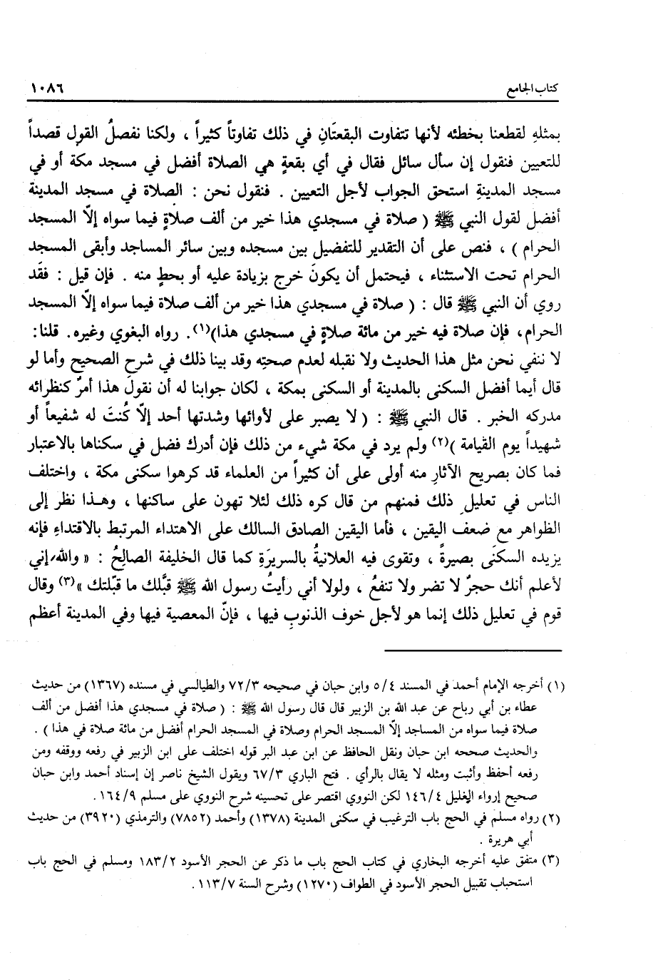 (¬1) أخرجه الإِمام أحمد في المسند 4/ 5 وابن حبان في صحيحه 3/ 72 والطيالسي في مسنده (1367) من حديث عطاء بن أبي رباح عن عبد الله بن الزبير قال قال رسول الله - صلى الله عليه وسلم -: (صلاة في مسجدي هذا أفضل من ألف صلاة فيما سواه من المساجد إلَّا المسجد الحرام وصلاة في المسجد الحرام أفضل من مائة صلاة في هذا). والحديث صححه ابن حبان ونقل الحافظ عن ابن عند البر قوله اختلف على ابن الزبير في رفعه ووقفه ومن رفعه أحفظ وأثبت ومثله لا يقال بالرأي. فتح الباري 3/ 67 ويقول الشيخ ناصر إن إسناد أحمد وابن حبان صحيح إرواء الِغليل 4/ 146 لكن النووي اقتصر على تحسينه شرح النووي على مسلم 9/ 164.