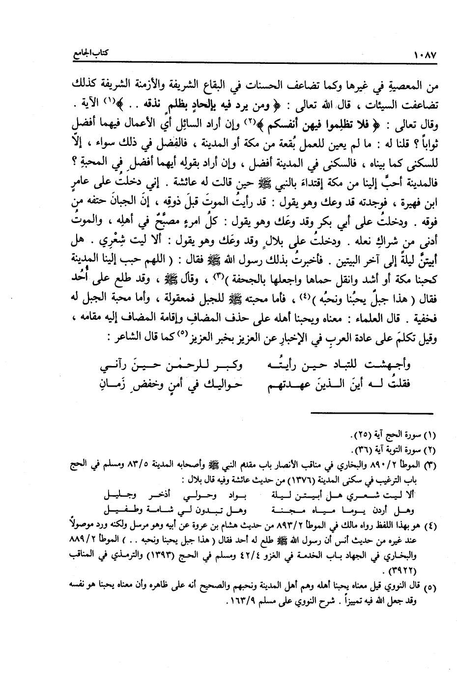 من المعصيةِ في غيرها وكما تضاعف الحسنات في البقاع الشريفة والأزمنة الشريفة كذلك تضاعفت السيئات، قال الله تعالى: {وَمَنْ يُرِدْ فِيهِ بِإِلْحَادٍ بِظُلْمٍ نُذِقْهُ ...} (¬1) الآية. وقال تعالى: {فَلَا تَظْلِمُوا فِيهِنَّ أَنْفُسَكُمْ} (¬2) وإن أراد السائِل أي الأعمال فيهما أفضل ثواباً؟ قلنا له: ما لم يعين للعمل بُقعة من مكة أو المدينة، فالفضل في ذلك سواء، إلَّا للسكنى كما بيناه، فالسكنى في المدينة أفضل، وان أراد بقوله أيهما أفضلِ في المحبةِ؟ فالمدينة أحبَّ إلينا من مكة إقتداءَ بالنبي - صلى الله عليه وسلم - حين قالت له عائشة. إني دخلتُ على عامرٍ ابن فهيرة، فوجدته قد وعك وهو يقول: قد رأيتُ الموتَ قبلَ ذوقه، إنَّ الجبانَ حتفه من فوقه. ودخلتُ على أبي بكر وقد وعَك وهو يقول: كلُ امرءٍ مصبَّحٌ في أهلِه، والموتُ أدنى من شراكِ نعله. ودخلتُ على بلالٍ وقد وعَك وهو يقول: ألا ليت شِعْرِي. هل أبيتنَّ ليلةً إلى آخر البيتين. فأخبرتُ بذلك رسول الله - صلى الله عليه وسلم - فقال: (اللهم حبب إلينا المدينة كحبنا مكة أو أشد وانقل حماها واجعلها بالجحفة) (¬3)، وقال - صلى الله عليه وسلم -، وقد طلع على أُحُد فقال (هذا جبلٌ يحبُنا ونحبُه) (¬4)، فأما محبته - صلى الله عليه وسلم - للجبل فمعقولة، وأما محبة الجبل له فخفية. قال العلماء: معناه ويحبنا أهله على حذف المضافِ وإقامة المضاف إليه مقامه، وقيل تكلمَ على عادة العربِ في الإخبارِ عن العزيز بخبر العزيز (¬5) كما قال الشاعر: