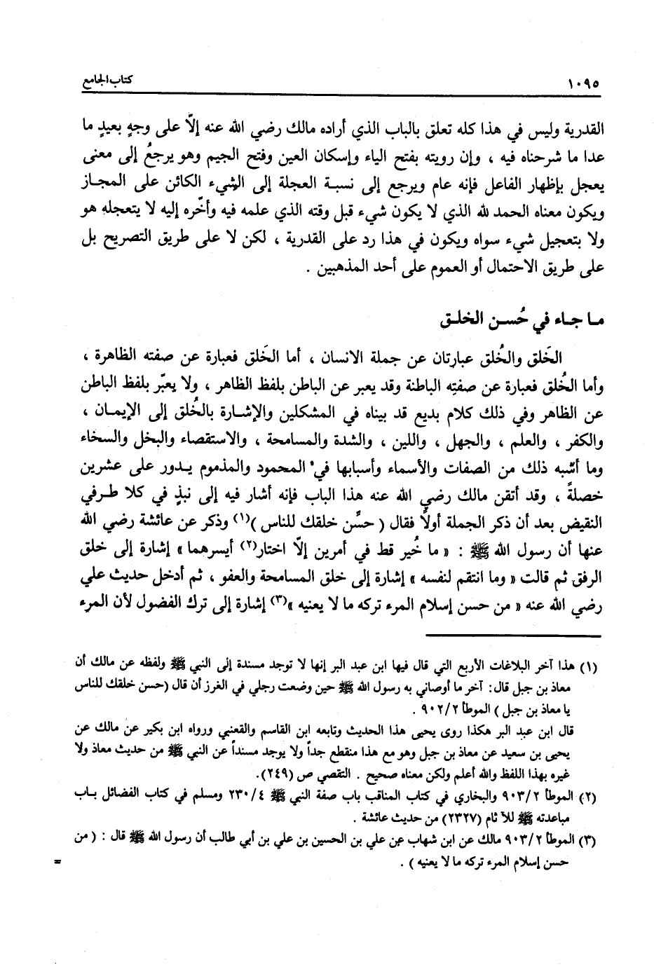 (¬1) هذا آخر البلاغات الأربع التي قال فيها ابن عبد البر إنها لا توجد مسندة إلى النبي - صلى الله عليه وسلم - ولفظه عن مالك أن معاذ بن جبل قال: آخر ما أوصاني به رسول الله - صلى الله عليه وسلم - حين وضعت رجلي في الغرز أن قال (حسن خلقك للناس يا معاذ بن جبل) الموطأ 2/ 902.