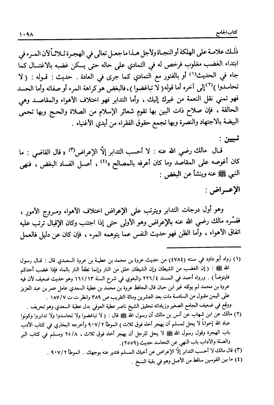 (¬2) مالك عن ابن شهاب عن أنس بن مالك أن رسول الله - صلى الله عليه وسلم - قال: (لا تباغضوا ولا تحاسدوا ولا تدابروا وكونوا عباد الله إخواناً لا يحل لمسلم أن يهجر أخاه فوق ثلاث) الموطأ 2/ 907 وأخرجه البخاري في كتاب الأدب باب الهجرة وقول رسول الله - صلى الله عليه وسلم - لا يحل للرجل أن يهجر أخاه فوق ثلاث، 8/ 25 ومسلم في كتاب البر والصلة والآداب باب النهي عن التحاسد حديث (2559).