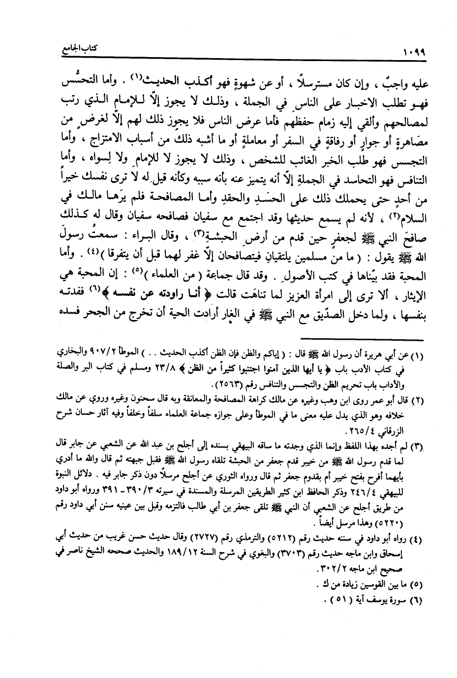 عليه واجبٌ، وإن كان مسترسلاً، أو عن شهوةٍ فهو أكذب الحديث (¬1). وأما التحسُّس فهو تطلب الاخبار على الناسِ في الجملة، وذلك لا يجوز إلَّا للإمام الذي رتب لمصالحهم وألقي إليه زمام حفظهم فأما عرض الناس قفلا يجوز ذلك لهم إلا لغرضٍ من مصَاهرةٍ أو جوارٍ أو رفاقةٍ في السفر أو معاملةٍ أو ما أشبه ذلك من أسباب الامتزاج، وأما التجسس فهو طلب الخبر الغائب للشخص، وذلك لا يجوز لا للإمام ولا لِسواه، وأما التنافس فهو التحاسد في الجملةِ إلَّا أنه يتميز عنه بأنه سببه وكأنه قيل له لاَ ترى نفسك خيرًا من أحدٍ حتى يحملك ذلك على الحسَدِ والحقدِ وأما المصافحة فلم يرَها مالك في السلام (¬2)، لأنه لم يسمع حديثها وقد اجتمع مع سفيان فصافحه سفيان وقال له كذلك صافحَ النبي - صلى الله عليه وسلم - لجعفرٍ حين قدم من أرضِ الحبشةِ (¬3)، وقال البراء: سمعتُ رسولَ الله - صلى الله عليه وسلم - يقول: (ما من مسلمين يلتقيانِ فيتصافحان إلَّا غفر لهما قبل أن يتفرقا) (¬4). وأما المحبة فقد بيّناها في كتب الأصولِ. وقد قال جماعة (من العلماء) (¬5): إن المحبة هي الإيثار، ألا ترى إلى امرأة العزيز لما تناهَت قالت (أنا راودته عن نفسه) (¬6) ففدته بنفسها، ولما دخل الصدّيق مع النبي - صلى الله عليه وسلم - في الغار أرادت الحية أن تخرج من الجحر فسده