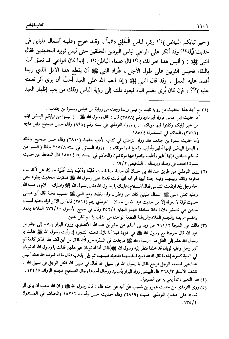 (¬5) روى الترمذي من حديث عمرو بن شعيب عنْ أبيه عن جده قال: قال رسول الله - صلى الله عليه وسلم - (إن الله يحب أن يرى أثر نعمته على عبده) الترمذي حديث (2819) وقال حديث حسن وأحمد 2/ 182 والحاكم في المستدرك 4/ 135.