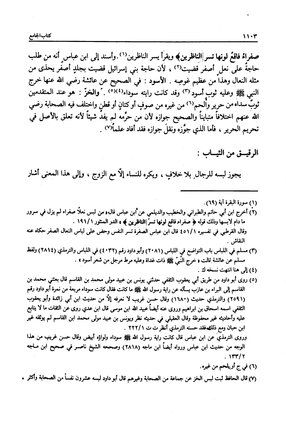 صَفْرَاءُ فَاقِعٌ لَوْنُهَا تَسُرُّ النَّاظِرِينَ} ويقرأ يسر الناظرين (¬1). وأسند إلى ابن عباسٍ أنه من طلب حاجةً على نعلٍ أصفر قضيت (¬2) , لأن حاجة بني إسرائيل قضيت بجلدٍ أصفر يحذى من مثله النعال وهذا في عظيم غوصِه. الأسود: في الصحيح عن عائشة رضي الله عنها خرج النبي - صلى الله عليه وسلم - وعليه ثوب أسود (¬3) وقد كانت رايته سوداء (¬4) (¬5). والخزّ: هو عند المتقدمين ثوبٌ سداه من حرير وأُلحم (¬6) من غيره من صوفٍ أوكتانٍ أو قطنٍ واختلف فيه الصحابة رضي الله عنهم اختلافاً متبايناً والصحيح جوازه لأن من حرَّمه لم يفد شيئاً لأنه تعلق بالأصل في تحريم الحرير، فأما الذي جوَّزه ونقلَ جوازه فقد أفاد علماً (¬7).