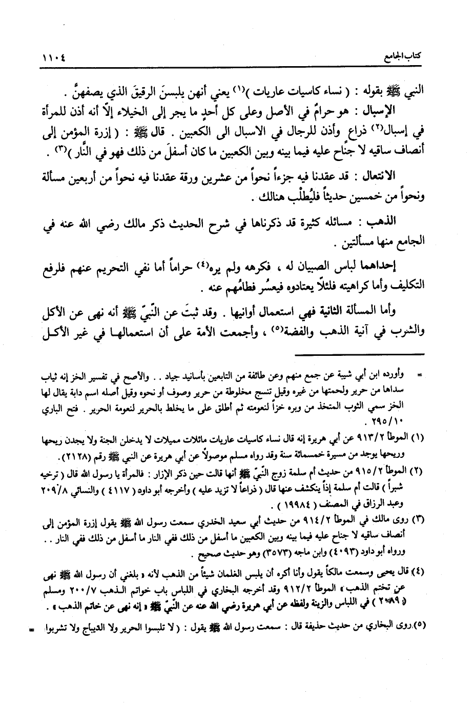 (¬3) روى مالك في الموطأ 2/ 914 من حديث أبي سعيد الخدري سمعت رسول الله - صلى الله عليه وسلم - يقول إزرة المؤمن إلى أنصاف ساقيه لا جناح عليه فيما بينه وبين الكعبين ما أسفل من ذلك ففي النار ما أسفل من ذلك ففي النار .. ورواه أبو داود (4093) وابن ماجه (3573) وهو حديث صحيح.