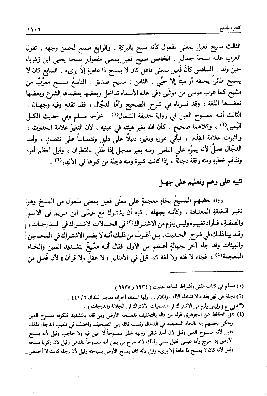 الثالث مسيح فعيل بمعنى مفعول كأنه مسح بالبركةِ. والرابع مسيح لحسن وجهه. تقول العرب عليه مسحة جمالٍ. الخامس مسيح فعيل بمعنى مفعول مسحه يحيى ابن زكرياء حينَ ولدَ. السادس كأنَ فَعيل بمعنى فاعل كان لا يمسح ذا عاهيةٍ إلَّا برىء. السابع كان لا يمسح طائراً يخلقه أو ميتاً إلاحيَّي الثامن: مسيح صديق. التاسعُ مسيح معرَّبٌ من مشيح كما عرب موسى من موشَى وفي هذه الأسماء تداخل وبعضها يعضدها الشرع وبعضها تعضدها اللغة، وقد فسرناه في شرحِ الصحيح وأمَّا الدجَّال، فقد تقدم وفيه وجهان. الثالث أنه ممسوح العين في رواية حذيفة الشمال (¬1). خرّجه مسلم وفي حديث الكل اليَمين (¬2)، وكلاهما صحيح. كأن الله يغير هيئته في عينيه, لأن التغيرَ علامة الحدوث، والثبوت علامة القِدَم، فيأتي عوره وتغيره دليلاً على دليل ونقصاناً على نقصانٍ، وأما الدجّال فعيلٌ لأنه يموّه على الناسِ ومنه بعير مدجل إذا طُلي بالقطران، وقيل لعظم أمره وتفاقم خطبهِ ومنه رفقةً دجالةً، إذا كانت كبيرة ومنه دجلة من كبرها في الأنهار (2).
