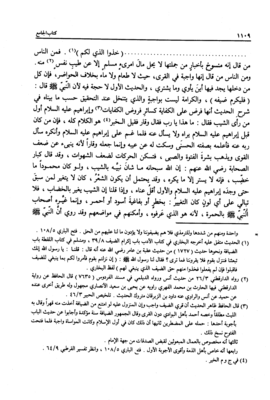 .............................. (خدْوا الذي لكم) (¬1). فمن الناس من قال إنه منسوخ بأخبارٍ من جملتها لا يحل مالَ امرىءٍ مسلمٍ إلا عن طيب نفسٍ (¬2) منه. ومن الناس من قال إنها واجبة في القرى، حيث لا طعام ولا ماء بخلاف الحواضر، فإن كل من دخلها يجد فيها أينَ يأوي وما يشتري، والحديث الأول لا حجة فيه لأن النبي - صلى الله عليه وسلم - قال: (فليكرم ضيفه)، والكرامة ليست بواجبةٍ والذي يتنخل عند التحقيق حسب ما بيناه في شرحِ الحديث أنها فرض على الكفاية كسائرِ فروض الكفايات (¬3) وإبراهيم عليه السلام أول من رأى الشيب فقال: ما هذا يا رب فقال وقار فقيل الخبر (¬4) هو الكلام كله، فإن من كان قبل إبراهيم عليه السلام يراه ولا يسأل عنه فلما غم على إبراهيم عليه السلام وأنكره سأل ربه عنه فأعلمه بصفته الحسنَى وسكت له عن عيبه وإنما جعله وقاراً لأنه ينبىء عن ضعف القوى ويذهب بشرةَ الفتوة والصبى، فتسكن الحركات لضعف الشهوات، وقد قال كبار الصحابة رضي الله عنهم: إن الله سبحانه ما شان نبيَّه بالشيب، ولو كان محموداً ما خضّب، فإنه لا يستر إلا ما يكره، وقد يحتمل أن يكون الشعْرُ، كان لا يتغير لمن سبقَ حتى وجدَه إبراهيم عليه السلام والأول أقلُ عناء، وإذا قلنا إن الشيب يغير بالخضاب، فلا تبالي على أي لونٍ كان التغييرُ: بخطرٍ أو بفاغيةَ أسود أو أحمر، وإنما غيَّره أصحاب النّبىّ - صلى الله عليه وسلم - بالحمرة, لأنه هو الذي عَرفوه، وأمكنهم في مواضعهم وقد روي أن النبي - صلى الله عليه وسلم -