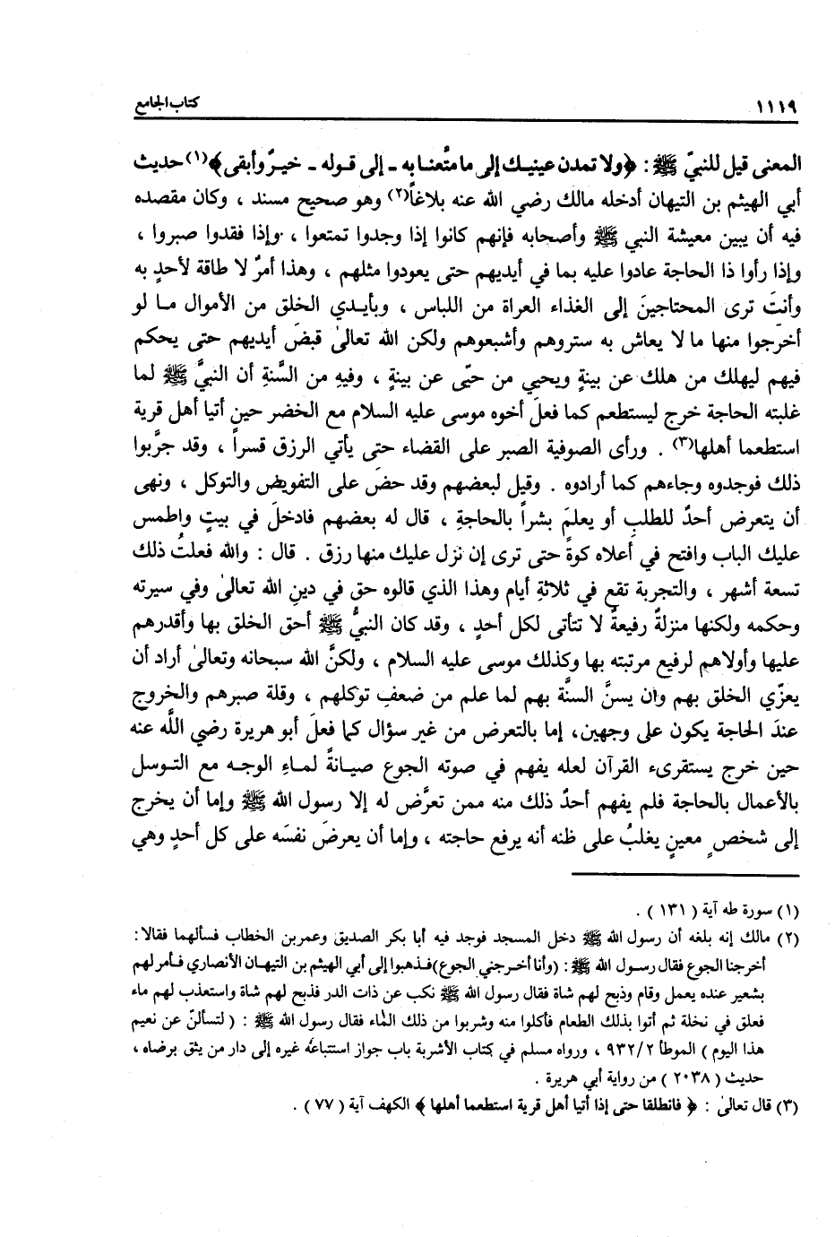المعنى قيل للنبي - صلى الله عليه وسلم -: {ولَا تَمُدَّنَّ عَيْنَيْكَ إِلَى مَا مَتَّعْنَا بِهِ - إلى قوله - خَيْرٌ وَأَبْقَى} (¬1) حديث أبي الهيثم بن التيهان أدخله مالك رضي الله عنه بلاغًا (¬2) وهو صحيح مسند، وكان مقصده فيه أن يبين معيشة النبي - صلى الله عليه وسلم - وأصحابه فإنهم كانوا إذا وجدوا تمتعوا, وإذا فقدوا صبروا، وإذا رأوا ذا الحاجة عادوا عليه بما في أيديهم حتى يعودا مثلهم، وهذا أمرٌ لا طاقة لأحدٍ به وأنتَ ترى المحتاجينَ إلى الغذاء العراة من اللباس، وبأيدي الخلق من الأموال ما لو أخرَجوا منها مالا يعاش به ستروهم وأشبعوهم ولكن الله تعالى قبضَ أيديهم حتى يحكم فيهم ليهلك من هلك عن بينةٍ ويحيي من حيّى عن بينةٍ، وفيهِ من السَّنةِ أن النبيَّ - صلى الله عليه وسلم - لما غلبته الحاجة خرج ليستطعم كما فعلَ أخوه موسى عليه السلام مع الخضر حين أتيا أهل قِرية استطعما أهلها (¬3). ورأى الصوفية الصبر على القضاء حتِى يأتي الرزق قسرًا، وقد جرَّبوا ذلك فوجدوه وجاءهم كما أرادوه. وقيل لبعضهم وقد حض على التفويض والتوكل، ونهى أن يتعرض أحدٌ للطلب أو يعلم بشرًا بالحاجةِ، قال له بعضهم فادخلَ في بيتٍ واطمس عليك الباب وافتح في أَعلاه كوةً حتى ترى إن نزل عليك منها رزق. قال: والله فعلتُ ذلك تسعة أشهر، والتجربة تقع في ثلاثةِ أيام وهذا الذي قالوه حق في دينِ الله تعالى وفي سيرته وحكمه ولكنها منزلةٌ رفيعة لا تتأتى لكل أحدٍ، وقد كان النبي - صلى الله عليه وسلم - أحق الخلق بها وأقدرهم عليها وأولاهم لرفيع مرتبته بها وكذلك موسى عليه السلام، ولكن الله سبحانه وتعالى أراد أن يعزّي الخلق بهم أن يسنَّ السنَّة بهم لما علم من ضعفِ توكلهم، وقلة صبرهم والخروج عندَ الحاجة يكون على وجهين، إما بالتعرض من غير سؤال كما فعلَ أبو هريرة رضي الله عنه حين خرج يستقرئ القرآن لعله يفهم في صوته الجوع صيانةً لماءِ الوجه مع التوسل بالأعمال بالحاجة فلم يفهم أحدٌ ذلك منه ممن تعرَّض له إلا رسول الله - صلى الله عليه وسلم - وإما أن يخرج إلى شخصٍ معينٍ يغلبُ على ظنه أنه يرفع حاجته، وإما أن يعرضَ نفسَه على كل أحدٍ وهي
