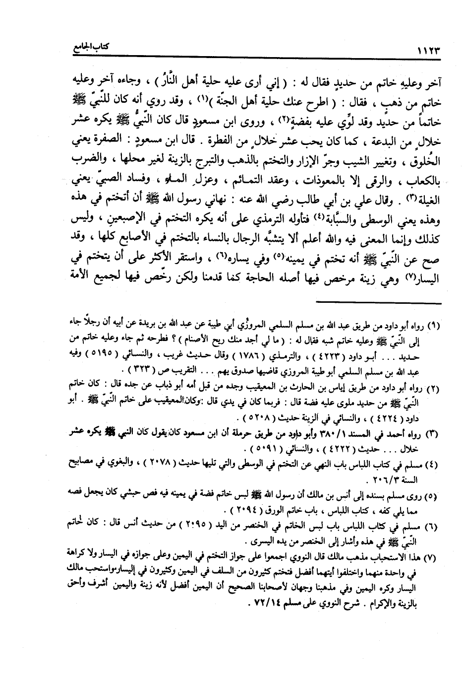 (¬5) روى مسلم بسنده إلى أنس بن مالك أن رسول الله - صلى الله عليه وسلم - لبس خاتم فضة في يمينه فيه فص حبشي كان يجعل فصه مما يلي كفه، كتاب اللباس، باب خاتم الورق (2094).