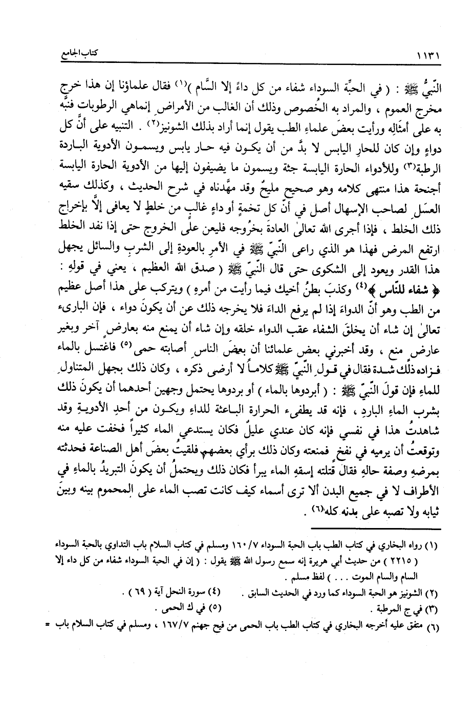 (¬1) رواه البخاري في كتاب الطب باب الحبة السوداء 7/ 160 ومسلم في كتاب السلام باب التداوي بالحبة السوداء (2215) من حديث أبي هريرة إنه سمع رسول الله - صلى الله عليه وسلم - يقول: (إن في الحبة السوداء شفاء من كل داء إلا السام والسام الموت ...) لفظ مسلم.