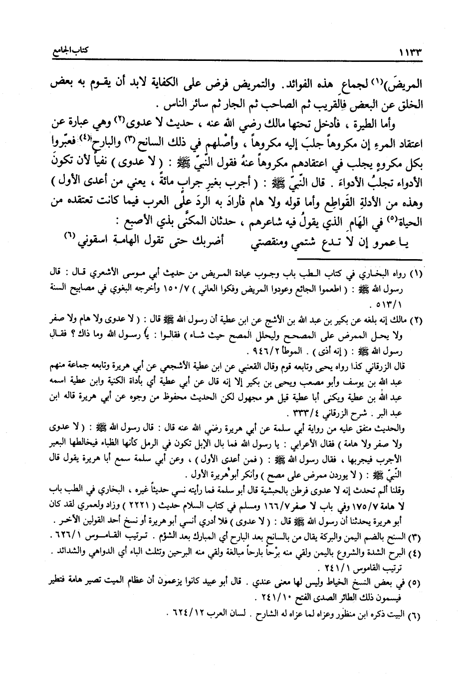 وأما الطيرة، فأدخل تحتها مالك رضي الله عنه، حديث لا عدوى (¬2) وهي عبارة عن اعتقاد المرءِ إن مكروهًا جلبَ إليه مكروهًا، وأصلهم في ذلك السانح (¬3) والبارح (¬4) فعبّروا بكل مكروهٍ يجلب في اعتقادهم مكروهًا عنهُ فقول النبي- صلى الله عليه وسلم -: (لا عدوى) نفياً لأن تكونَ الأدواء تجلبُ الأدواءَ. قال النبي- صلى الله عليه وسلم -: (أجرب بغيرِ جرابٍ مائة، يعني من أعدى الأول) وهذه من الأدلةِ القَواطِع وأما قوله ولا هام فأرادَ به الردَ على العرب فيما كانت تعتقده من الحياة (¬5) في الهَام الذي يقولُ فيه شاعرهم، حدثان المكنَّى بذي الأصبع: