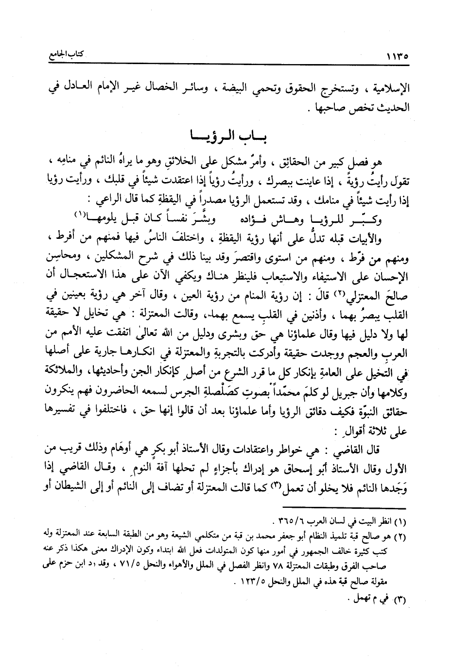 والأبيات قبله تدلُّ على أنها رؤية اليقظةِ، واختلفَ الناسُ فيها فمنهم من أفرط، ومنهم من فرّط، ومنهم من استوى واقتصرَ وقد بينا ذلك في شرح المشكلين، ومحاسِن الإحسان على الاستيفاء والاستيعاب فلينظر هناك ويكفي الآن على هذا الاستعجال أن صالحَ المعتزلي (¬2) قالَ: إن رؤية المنام من رؤية العين، وقال آخر هي رؤية بعينين في القلب يبصرُ بهما، وأذنين في القلبِ يسمع بهما، وقالت المعتزلة: هي تخايل لا حقيقة لها ولا دليل فيها وقال علماؤنا هي حق وبشرى ودليل من الله تعالى اتفقت عليه الأمم من العرب والعجم ووجدت حقيقة وأدركت بالتجربةِ والمعتزلة في انكارها جارية على أصلها في التَخيل على العامةِ بإنكار كل ما قرر الشرع من أصلِ كإنكار الجن وأحاديثها، والملائكة وكلامها وأن جبريل لو كلمَ محمَّدًا بصوتِ كصَلْصلةِ الجرس لسمعه الحاضرون فهم ينكرون حقائق النبوّة فكيف دقائق الرؤيا وأما علماؤنا بعد أن قالوا إنها حق، فاختلفوا في تفسيرها على ثلاثة أقوالِ: