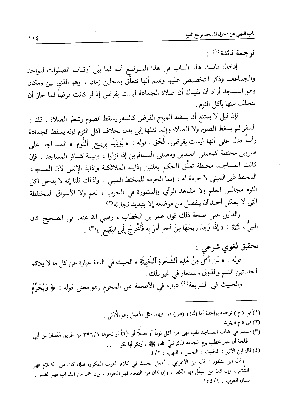 قوله: "مَنْ أَكَلَ مِنْ هذِهِ الشَّجَرَةِ الخَبِيثَةِ" الخبث في اللغة عبارة عن كل ما لا يلائم الحاستين الشم والذوق ويستعار في غير ذلك.
