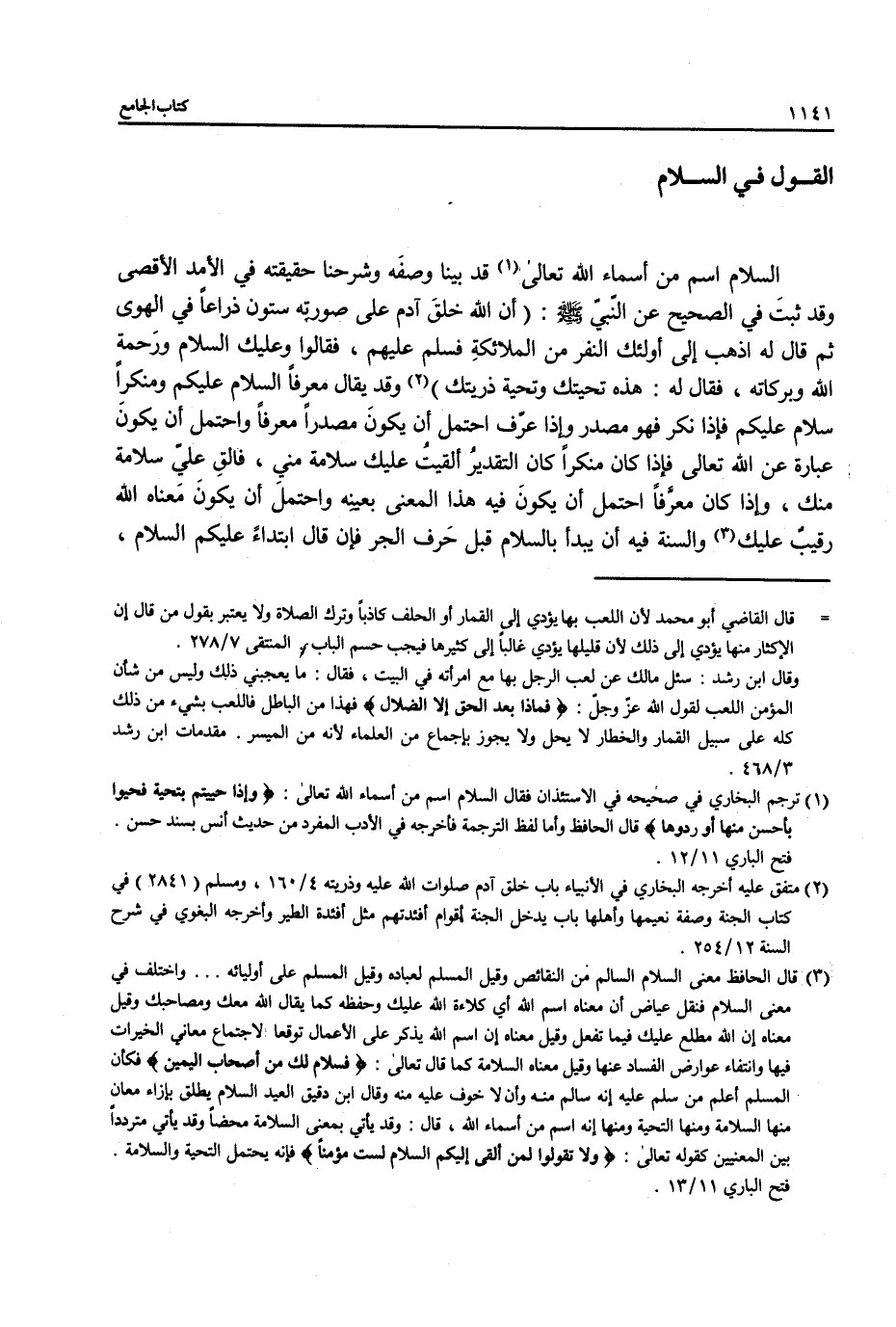 السلام اسم من أسماء الله تعالى (¬1) قد بينا وصفَه وشرحنا حقيقته في الأمد الأقصى وقد ثبتَ في الصحيح عن النبي- صلى الله عليه وسلم -: (أن الله خلقَ آدم على صورته ستون فراعًا في الهوى ثم قال له اذهب إلى أولئك النفر من الملائكةِ فسلم عليهم، فقالوا وعليك السلام ورَحمة الله وبركاته، فقال له: هذه تحيتك وتحية ذريتك) (¬2) وقد يقال معرفًا السلام عليكم ومنكرًا سلام عليكم فإذا نكر فهو مصدر وإذا عرّف احتمل أن يكونَ مصدرًا معرفاً واحتمل أن يكون عبارة عن الله تعالى فإذا كان منكرًا كان التقديرُ ألقيتُ عليك سلامة مني، فالقِ عليّ سلامة منك، وإذا كان معرَّفًا احتمل أن يكونَ فيه هذا المعنى بعينه واحتملَ أن يكون معناه الله رقيبٌ عليك (¬3) والسنة فيه أن يبدأ بالسلام قبل حَرف الجر فإن قال ابتداءً عليكم السلام،