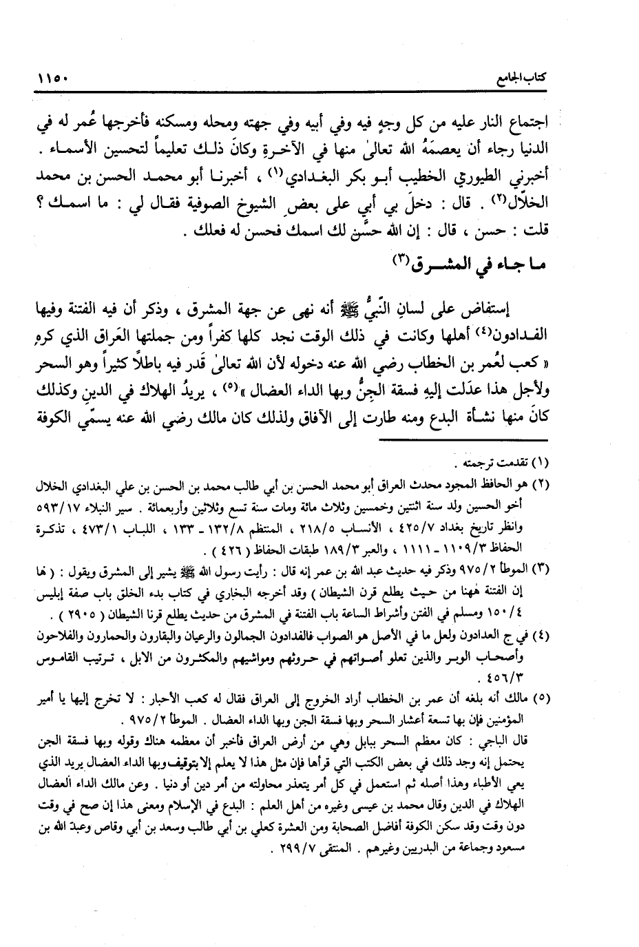(¬5) مالك أنه بلغه أن عمر بن الخطّاب أراد الخروج إلى العراق فقال له كعب الأحبار: لا تخرج إليها يا أمير المؤمنين فإن بها تسعة أعشار السحر وبها فسقة الجن وبها الداء العضال. الموطأ 2/ 975.