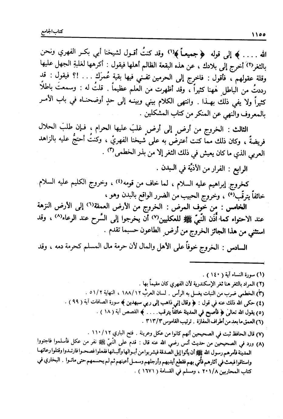 الثالث: الخروج من أرضٍ إلى أرضٍ غلبَ عليها الحرام، فإن طلبَ الحلال فريضةً، وكان ذلك مما كنت أعترض به على شيخنا الفهريّ، وكنتُ أحتجُ عليه بالزاهد العربي الذي ما كان يعيش في ذلك الثغر إلا من بذر الخطمى (¬3).
