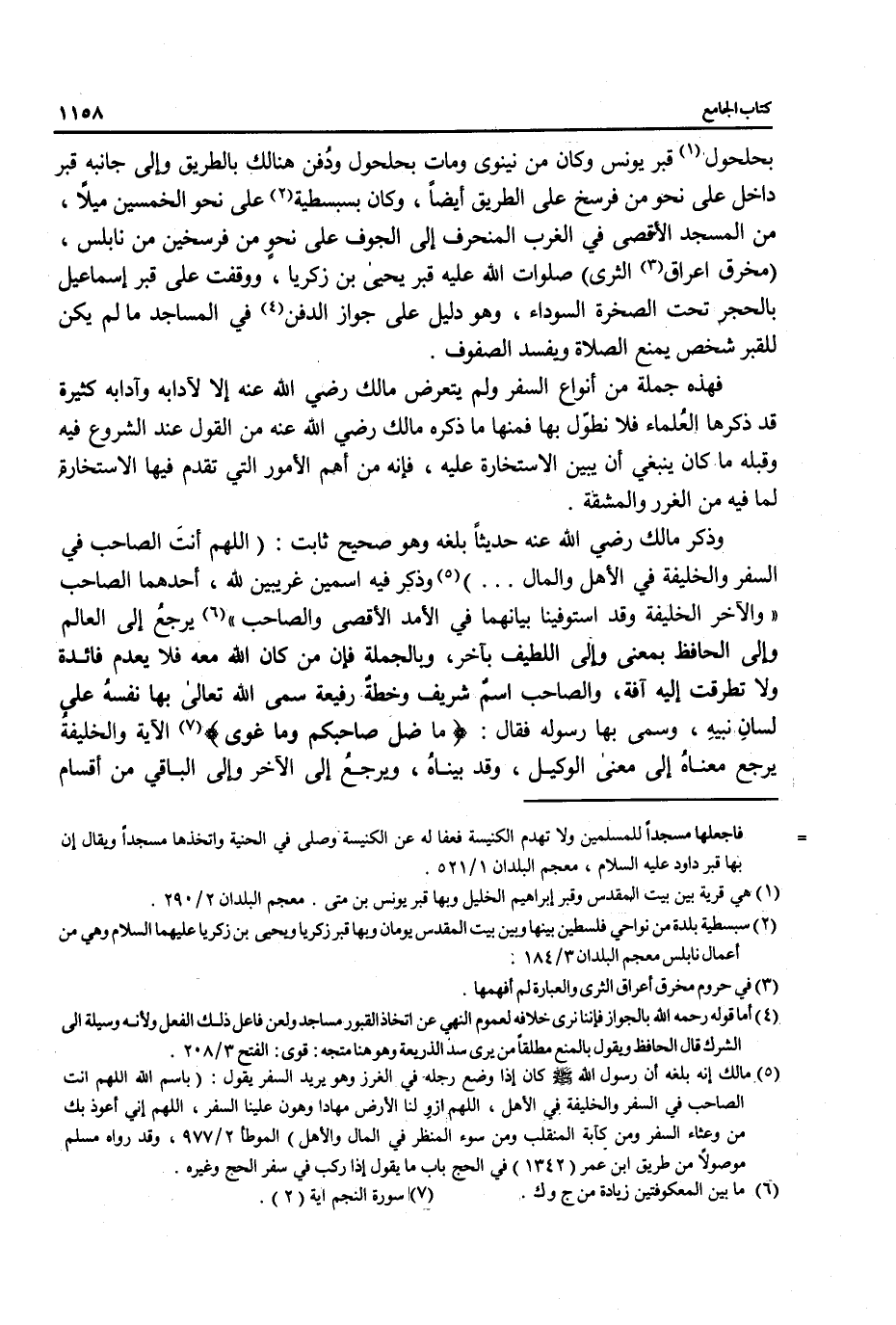 بحلحول (1) قبر يونس وكان من نينوى ومات بحلحول ودُفن هنالك بالطريق وإلى جانبه قبر داخل على نحو من فرسخ على الطريق أيضًا، وكان بسبسطية (¬2) على نحو الخمسين ميلًا، من المسجد الأقصى في الغرب المنحرف إلى الجوف على نحوٍ من فرسخين من نابلس، (مخرق اعراق (¬3) الثرى) صلوات الله عليه قبر يحيى بن زكريا، ووقفت على قبر إسماعيل بالحجر تحت الصخرة السوداء، وهو دليل على جواز الدفن (¬4) في المساجد ما لم يكن للقبر شخص يمنع الصلاة ويفسد الصفوف.