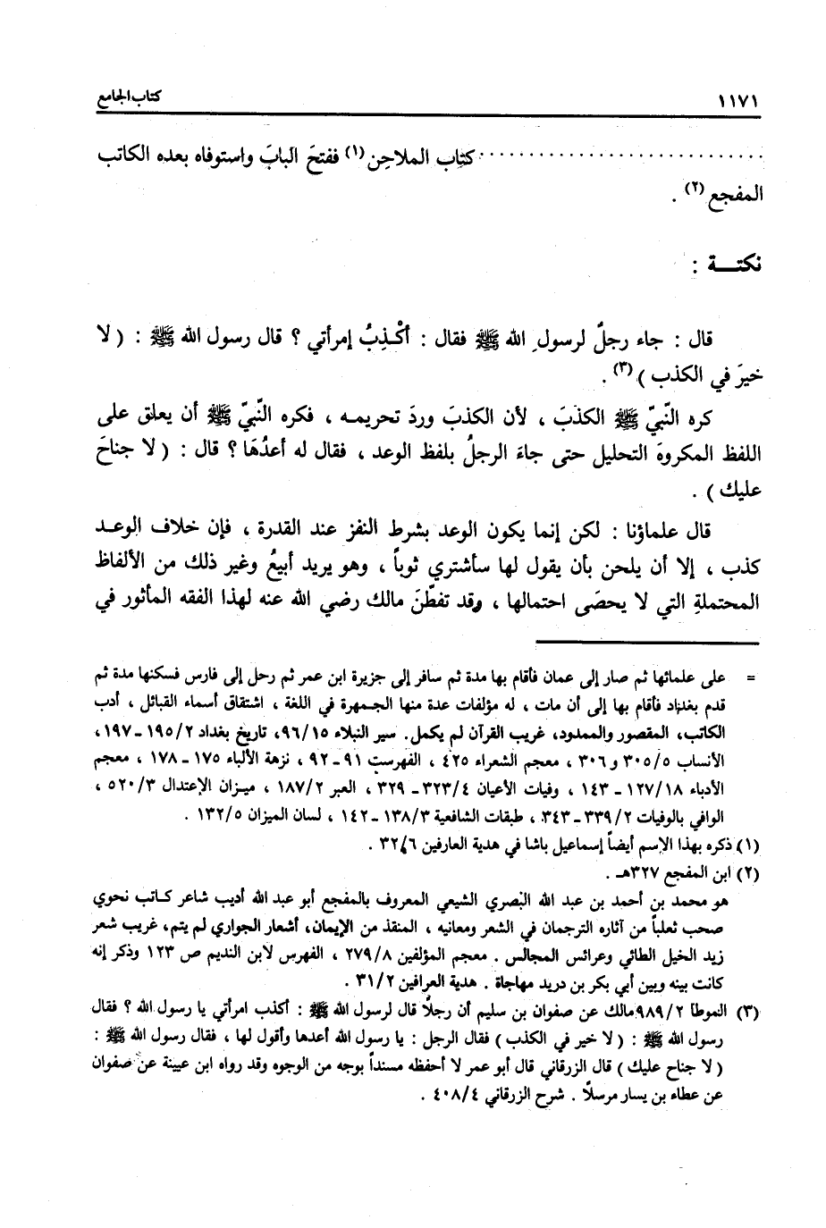 (¬3) الموطأ 2/ 989 مالك عن صفوان بن سليم أن رجلًا قال لرسول - صلى الله عليه وسلم -: أكذب امرأتي يا رسول الله؟ فقال رسول - صلى الله عليه وسلم -: (لا خير في الكذب) فقال الرجل: يا رسول أعدها وأقول لها، فقال رسول الله - صلى الله عليه وسلم -: (لا جناح عليك) قال الزرقاني قال أبو عمر لا أحفظه مسندًا بوجه من الوجوه وقد رواه ابن عيينة عن صفوان عن عطاء بن يسار مرسلًا. شرح الزرقانى 4/ 408.