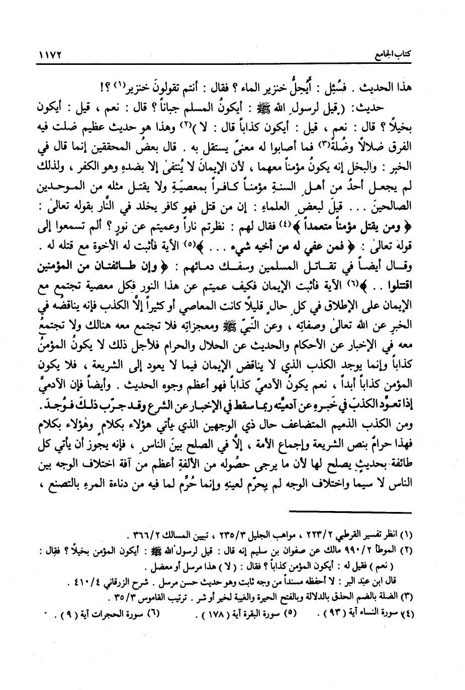 (¬2) الموطأ 2/ 990 مالك عن صفوان بن سليم إنه قال: قيل لرسول الله - صلى الله عليه وسلم -: أيكون المؤمن بخيلاً؟ فقال: (نعم) فقيل له: أيكون المؤمن كذاباً؟ فقال: (لا) هذا مرسل أو معضل.