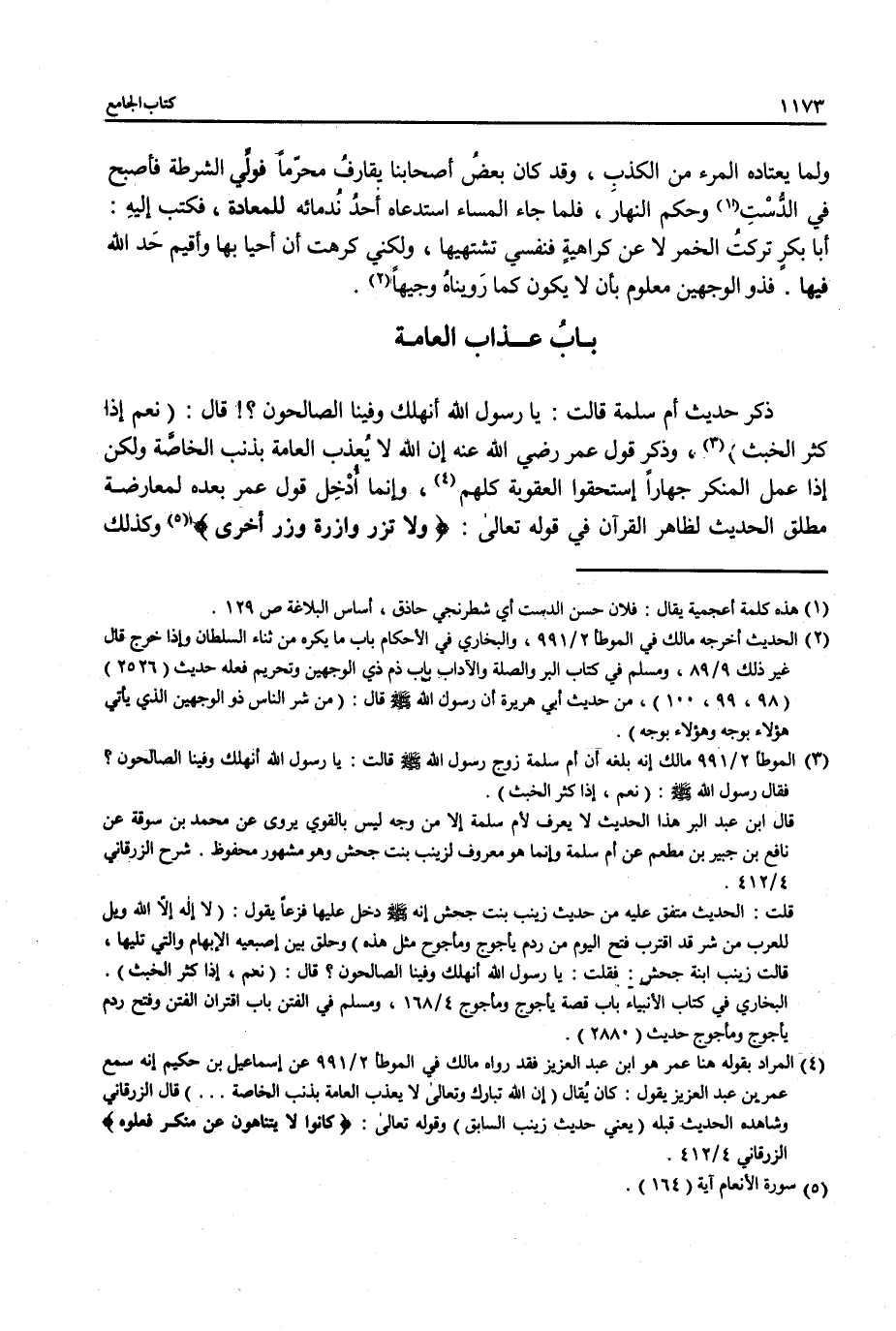 (¬4) المراد بقوله هنا عمر هو ابن عبد العزيز فقد رواه مالك في الموطأ 2/ 991 عن إسماعيل بن حكيم إنه سمع عمر بن عبد العزيز يقول: كان يُقال (إن الله تبارك وتعالى لا يعذب العامة بذنب الخاصة ...) قال الزرقاني وشاهده الحديث قبله (يعني حديث زينب السابق) وقوله تعالى: {كَانُوا لَا يَتَنَاهَوْنَ عَنْ مُنْكَرٍ فَعَلُوهُ} الزرقاني 4/ 412.