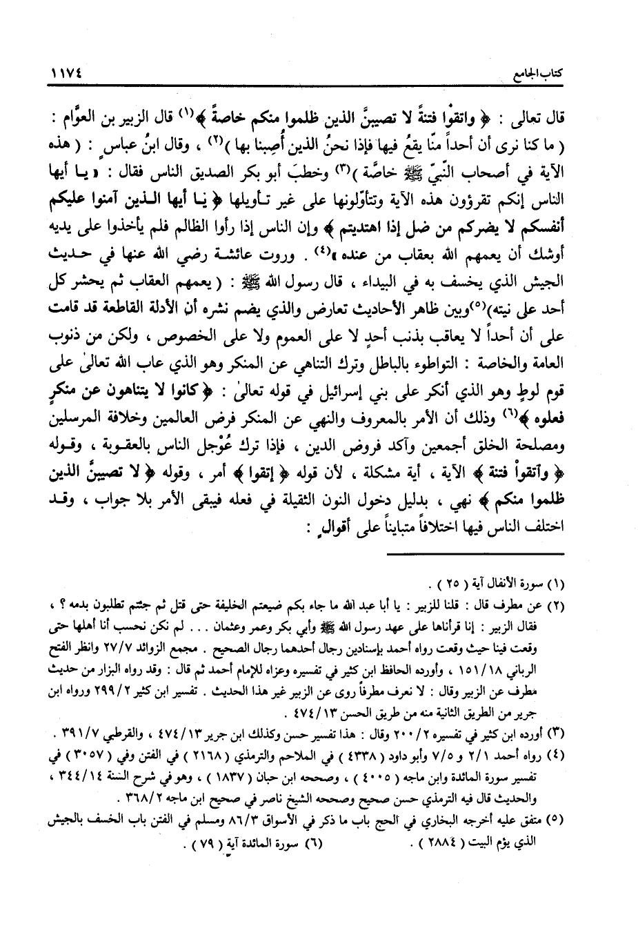 قال تعالى: {وَاتَّقُوا فِتْنَةً لَا تُصِيبَنَّ الَّذِينَ ظَلَمُوا مِنْكُمْ خَاصَّةً} (¬1) قال الزبير بن العوَّام: (ما كنا نرى أن أحدًا منّا يقعُ فيها فإذا نحنُ الذين أُصِبنا بها) (¬2)، وقال ابنُ عباس: (هذه الآية في أصحاب النبي- صلى الله عليه وسلم - خاصَّة) (¬3) وخطبَ أبو بكر الصديق الناس فقال: "يا أيها الناس إنكم تقرؤون هذه الآية وتتأوّلونها على غير تأويلها {يَا أَيُّهَا الَّذِينَ آمَنُوا عَلَيْكُمْ أَنْفُسَكُمْ لَا يَضُرُّكُمْ مَنْ ضَلَّ إِذَا اهْتَدَيْتُمْ} وإن الناس إذا رأوا الظالم فلم يأخذوا على يديه أوشك أن يعمهم الله بعقاب من عنده" (¬4). وروت عائشة رضي الله عنها في حديث الجيش الذي يخسف به في البيداء، قال رسول الله - صلى الله عليه وسلم -: (يعمهم العقاب ثم يحشر كل أحد على نيته) (¬5) وبين ظاهر الأحاديث تعارض والذي يضم نشره أن الأدلة القاطعة قد قامت على أن أحدًا لا يعاقب بذنب أحدٍ لا على العموم ولا على الخصوص، ولكن من ذنوب العامة والخاصة: التواطوء بالباطل وترك التناهي عن المنكر وهو الذي عاب الله تعالى على قوم لوطٍ وهو الذي أنكر على بني إسرائيل في قوله تعالى: {كَانُوا لَا يَتَنَاهَوْنَ عَنْ مُنْكَرٍ فَعَلُوهُ} (¬6) وذلك أن الأمر بالمعروف والنهي عن المنكر فرض العالمين وخلافة المرسلين ومصلحة الخلق أجمعين وآكد فروض الدين، فإذا ترك عُوْجل الناس بالعقوبة، وقوله {وَاتَّقُوا فِتْنَةً} الآية، آية مشكلة, لأنّ قوله {إتَّقُوا} أمر، وقوله {لَا تُصِيبَنَّ الَّذِينَ ظَلَمُوا مِنْكُمْ} نهي، بدليل دخول النون الثقيلة في فعله فيبقى الأمر بلا جواب، وقد اختلف الناس فيها اختلافًا متباينًا على أقوالٍ: