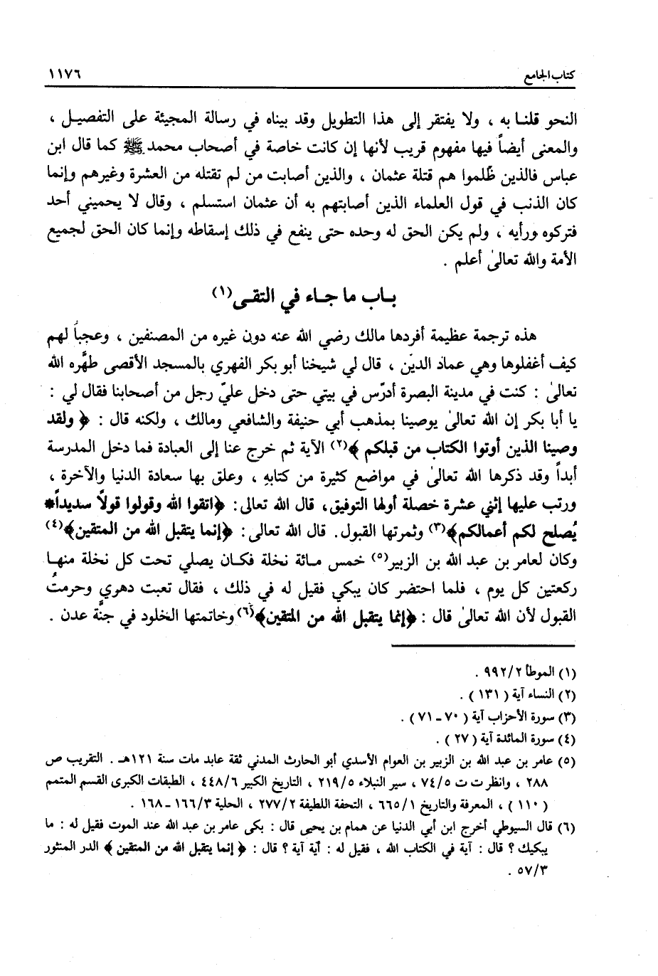 هذه ترجمة عظيمة أفردها مالك رضي الله عنه دون غيره من المصنفين، وعجبًا لهم كيف أغفلوها وهي عماد الدين، قال لي شيخنا أبو بكر الفهري بالمسجد الأقصى طهَّره الله تعالى: كنت في مدينة البصرة أدرّس في بيتي حتى دخل عليّ رجل من أصحابنا فقال لي: يا أبا بكر إن الله تعالى يوصينا بمذهب أبي حنيفة والشافعي ومالك، ولكنه قال: {وَلَقَدْ وَصَّيْنَا الَّذِينَ أُوتُوا الْكِتَابَ مِنْ قَبْلِكُمْ} (¬2) الآية ثم خرج عنا إلى العبادة فما دخل المدرسة أبدًا وقد ذكرها الله تعالى في مواضع كثيرة من كتابهِ، وعلق بها سعادة الدنيا والآخرة، ورتب عليها إثني عشرة خصلة أولها التوفيق، قال الله تعالى: {اتَّقُوا اللَّهَ وَقُولُوا قَوْلًا سَدِيدًا (70) يُصْلِحْ لَكُمْ أَعْمَالَكُمْ} (¬3) وثمرتها القبول. قال الله تعالى: {إِنَّمَا يَتَقَبَّلُ اللَّهُ مِنَ الْمُتَّقِينَ} (¬4) وكان لعامر بن عبد الله بن الزبير (¬5) خمس مائة نخلة فكان يصلي تحت كل نخلة منها ركعتين كل يوم، فلما احتضر كان يبكي فقيل له في ذلك، فقال تعبت دهري وحرمتُ القبول لأنّ الله تعالى قال: {إِنَّمَا يَتَقَبَّلُ اللَّهُ مِنَ الْمُتَّقِينَ} (¬6) وخاتمتها الخلود في جنة عدن.