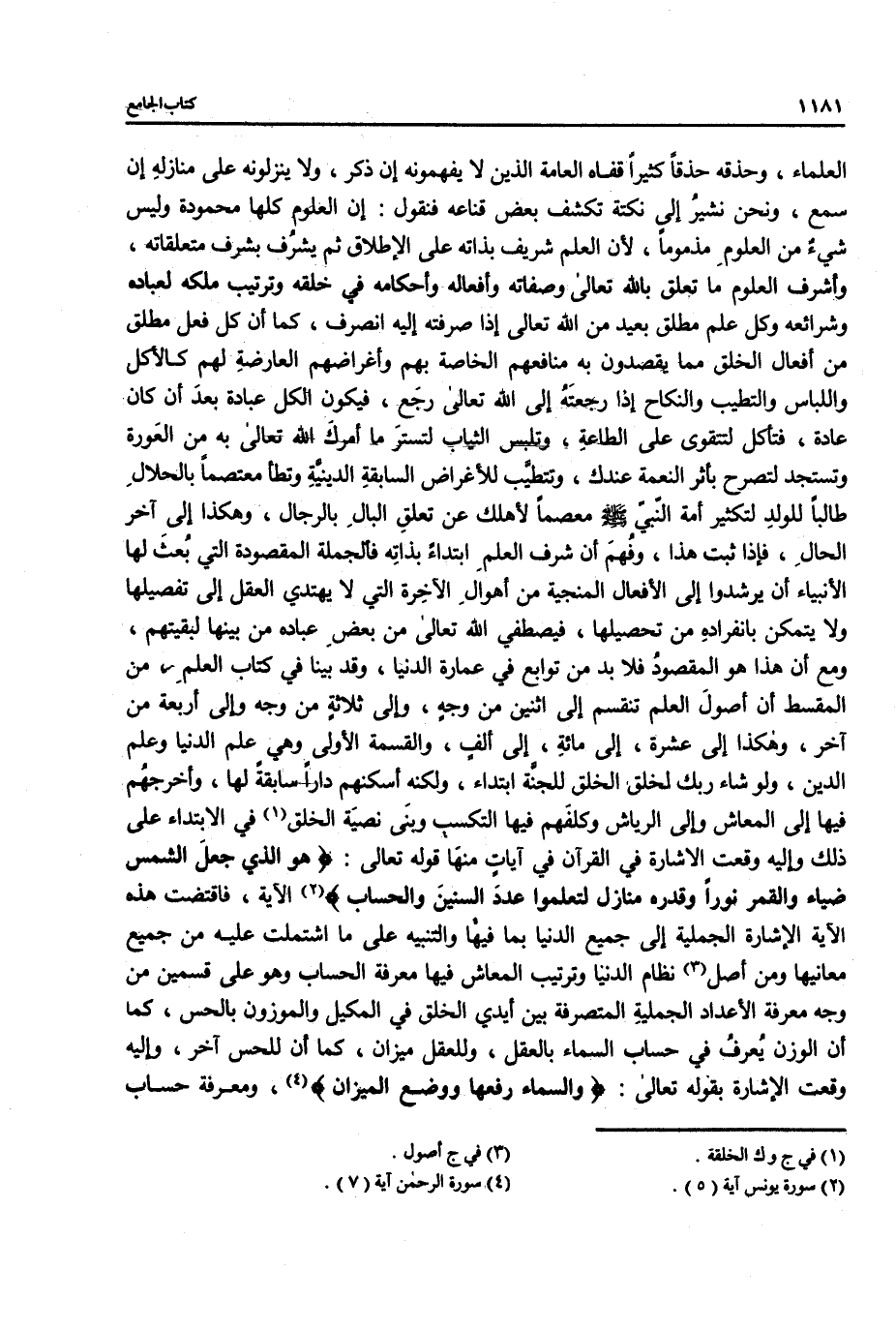 العلماء، وحذقه حذقًا كثيرًا قفاه العامة الذين لا يفهمونه إن ذكر، ولا ينزلونه على منازلهِ إن سمع، ونحن نشيرُ إلى نكتة تكشف بعض قناعه فنقول: إن العلوم كلها محمودة وليس شيء من العلومِ مذمومًا, لأنّ العلم شريف بذاته على الإطلاق ثم يشرُف بشرف متعلقاته، وأشرف العلوم ما تعلق بالله تعالى وصفاته وأفعاله وأحكامه في خلقه وترتيب ملكه لعباده وشرائعه وكل علم مطلق بعيد من الله تعالى إذا صرفته إليه انصرف، كما أن كل فعل مطلق من أفعال الخلق مما يقصدون به منافعهم الخاصة بهم وأغراضهم العارضةِ لهم كالأكل واللباس والتطيب والنكاح إذا رجعتَهُ إلى الله تعالى رجع، فيكون الكل عبالة بعدَ أن كان عادة، فتأكل لتتقوى على الطاعةِ، وتلبس الثياب لتسترَ ما أمرك الله تعالى به من العَورة وتستجد لتصرح بأثر النعمة عندك، وتتطيَّب للأغراض السابقة الدينيَّةِ وتطأ معتصمًا بالحلالِ طالبًا للولدِ لتكثير أمة النبي- صلى الله عليه وسلم - معصمًا لأهلك عن تعلق البالِ بالرجال, وهكذا إلى آخر الحالِ، فإذا ثبت هذا، وفُهمَ أن شرف العلمِ ابتداءً بذاتِه فالجملة المقصودة التي بُعثَ لها الأنبياء أن يرشدوا إلى الأفعال المنجية من أهوالِ الآخرة التي لا يهتدي العقل إلى تفصيلها ولا يتمكن بانفراده من تحصيلها، فيصطفي الله تعالى من بعض عباده من بينها لبقيتهم، ومع أن هذا هو المقصود فلا بد من توابع في عمارة الدنيا، وقد بينا في كتاب العلم من المقسط أن أصولَ العلم تنقسم إلى اثنين من وجهٍ، وإلى ثلاثةٍ من وجه وإلى أربعة من آخر، وهكذا إلى عشرة، إلى مائة، إلى ألفٍ، والقسمة الأولى. وهي علم الدنيا وعلم الدين، ولو شاء ربك لخلق الخلق للجنة ابتداء، ولكنه أسكنهم داراً سابقةً لها، وأخرجهُم فيها إلى المعاش وإلى الرياش وكلفهم فيها التكسب وبنَى نصية الخلق (¬1) في الابتداء على ذلك وإليه وقعت الإشارة في القرآن في آياتٍ منهَا قوله تعالى: {هُوَ الَّذِي جَعَلَ الشَّمْسَ ضِيَاءً وَالْقَمَرَ نُورًا وَقَدَّرَهُ مَنَازِلَ لِتَعْلَمُوا عَدَدَ السِّنِينَ وَالْحِسَابَ} (¬2) الآية، فاقتضت هذه الآية الإشارة الجملية إلى جميع الدنيا بما فيها والتنبيه على ما اشتملت عليه من جميع معانيها ومن أصل (¬3) نظام الدنيا وترتيب المعاش فيها معرفة الحساب وهو على قسمين من وجه معرفة الأعداد الجملية المتصرفة بيّن أيدي الخلق في المكيل والمهوزون بالحس، كما أن الوزن يُعرفُ في حساب السماء بالعقل، وللعقل ميزان، كما أن للحس آخر، وإليه وقعت الإشارة بقوله تعالى: {وَالسَّمَاءَ رَفَعَهَا وَوَضَعَ الْمِيزَانَ} (¬4)، ومعرفة حساب