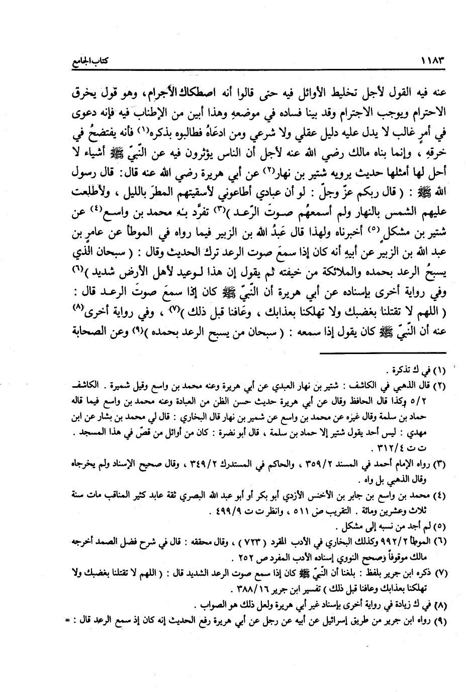 عنه فيه القول لأجل تخليط الأوائل فيه حتى قالوا أنه اصطكاك الأجرام، وهو قول يخرق الاحترام ويوجب الاجترام وقد بينا فساده في موضعهِ وهذا أبين من الإطناب فيه فإنه دعوى في أمرٍ غالب لا يدلّ عليه دليل عقلي ولا شرعي ومن ادعَاهُ فطالبوه بذكره (¬1) فأنه يفتضحُ في خرقهِ، وإنما بناه مالك رضي الله عنه لأجل أن الناس يؤثرون فيه عن النبي- صلى الله عليه وسلم - أشياء لا أحل لها أمثلها حديث يرويه شتير بن نهار (¬2) عن أبي هريرة رضي الله عنه قال: قال رسول الله - صلى الله عليه وسلم -: (قال ربكم عز وجل: لو أن عبادي أطاعوني لأسقيتهم المطرَ بالليل، ولأطبعت عليهم الشمس بالنهار ولم أسمعهُم صوتَ الرعد) (¬3) تفرَّد به محمَّد بن واسع (¬4) عن شتير بن مشكلٍ (¬5) أخبرناه ولهذا قال عَبدُ الله بن الزبير فيما رواه في الموطأ عن عامرٍ بن عبد الله بن الزبير عن أبيهِ أنه كان إذا سمعَ صوت الرعد ترك الحديث وقال: (سبحان الذي يسبحُ الرعد بحمده والملائكة من خيفته ثَم يقول إن هذا لوعيد لأهل الأرض شديد) (¬6) وفي رواية أخرى بإسناده عن أبي هريرة أن النبي- صلى الله عليه وسلم - كان إذا سمعَ صوتَ الرعد قال: (اللهم لا تقتلنا بغضبك ولا تهلكنا بعذابك، وعَافنا قبل ذلك) (¬7)، وفي رواية أخرى (¬8) عنه أن النبي- صلى الله عليه وسلم - كان يقول إذا سمعه: (سبحان من يسبح الرعد بحمده) (¬9) وعن الصحابة
