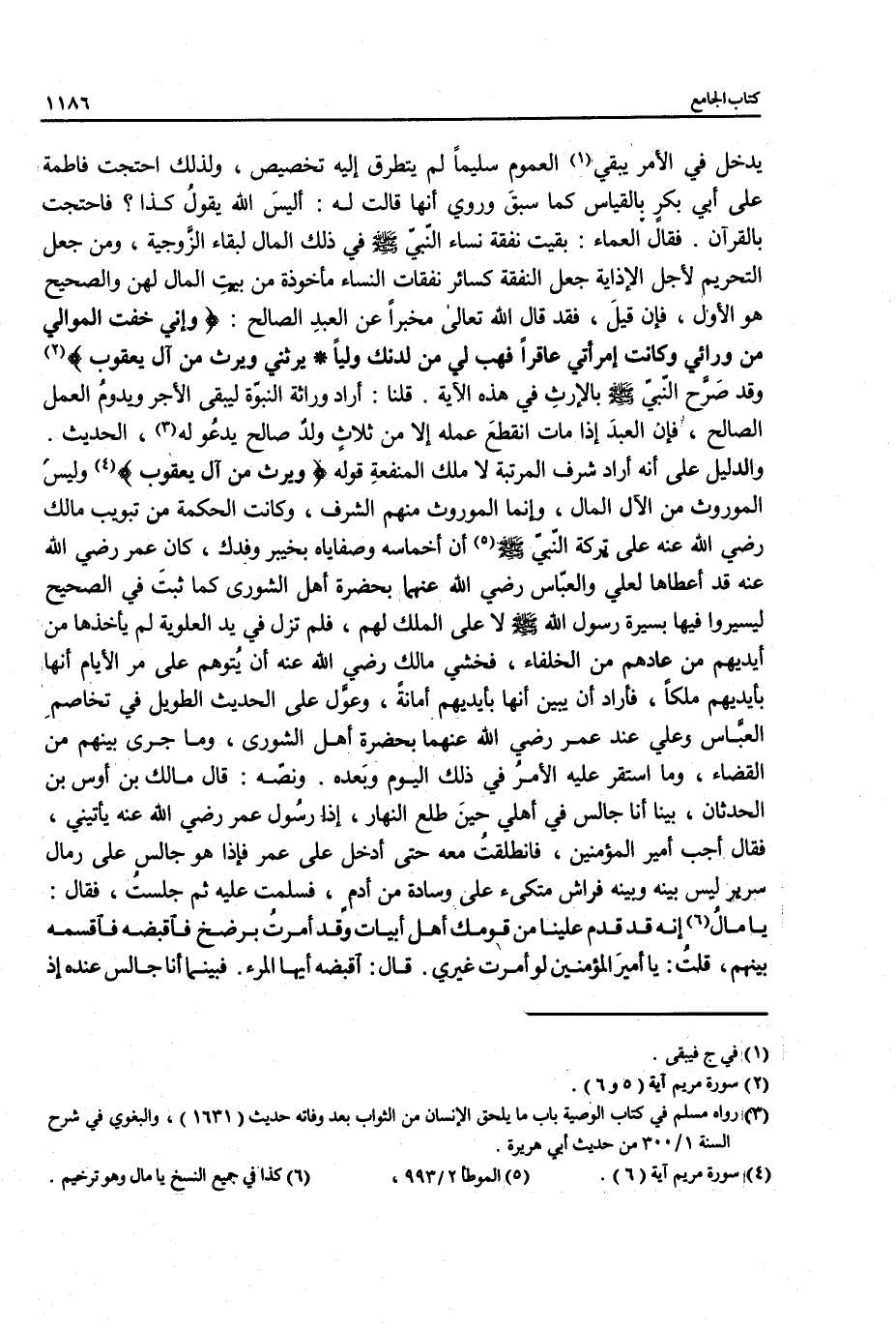 يدخل في الأمر يبقي (¬1) العموم سليمًا لم يتطرق إليه تخصيص، ولذلك احتجت فاطمة على أبي بكرٍ يالقياس كما سبقَ وروي أنها قالت له: أليسَ الله يقولُ كذا؟ فاحتجت بالقرآن. فقال العلماء: بقيت نفقة نساء النبي- صلى الله عليه وسلم - في ذلك المال لبقاء الزَّوجية، ومن جعل التحريم لأجل الإذاية جعل النفقة كسائر نفقات النساء مأخوذة من بيتِ المال لهن والصحيح هو الأول، فإن قيلَ، فقد قال الله تعالى مخبرًا عن العبدِ الصالح: {وَإِنِّي خِفْتُ الْمَوَالِيَ مِنْ وَرَائِي وَكَانَتِ امْرَأَتِي عَاقِرًا فَهَبْ لِي مِنْ لَدُنْكَ وَلِيًّا (5) يَرِثُنِي وَيَرِثُ مِنْ آلِ يَعْقُوبَ} (¬2) وقد صَرَّح النبي- صلى الله عليه وسلم - بالإرثِ في هذه الآية. قلنا: أراد وراثة النبوّة ليبقى الأجر ويدومُ العمل الصالح، فإن العبدَ إذا مات انقطعَ عمله إلا من ثلاث ولدٌ صالح يدعُو له (¬3)، الحديث. والدليل على أنه أراد شرف المرتبة لا ملك المنفعةِ قوله {وَيَرِثُ مِنْ آلِ يَعْقُوبَ} (¬4) وليس الموروث من الآل المال، وإنما الموروث منهم الشرف، وكانت الحكمة من تبويب مالك رضي الله عنه على تركة النبي - صلى الله عليه وسلم - (¬5) أن أخماسه وصفاياه بخيبر وفدك، كان عمر رضي الله عنه قد أعطاها لعلي والعباس رضي الله عنهما بحضرة أهل الشورى كما ثبتَ في الصحيح ليسيروا فيها بسيرة رسول الله - صلى الله عليه وسلم - لا على الملك لهم، فلم تزل في يد العلوية لم يأخذها من أيديهم من عادهم من الخلفاء، فخشي مالك رضي الله عنه أن يُتوهم على مر الأيام أنها بأيديهم ملكًا، فأراد أن يبين أنها بأيديهم أمانةً، وعوَّل على الحديث الطويل في تخاصمِ العبَّاس وعلي عند عمر رضي الله عنهما بحضرة أهل الشورى، وما جرى بينهم من القضاء، وما استقر عليه الأمرُ في ذلك اليوم وبَعده. ونصّه: قال مالك بن أوس بن الحدثان، بينا أنا جالس في أهلي حينَ طلع النهار، إذا رسُول عمر رضي الله عنه يأتيني، فقال أجب أمير المؤمنين، فانطلقتُ معه حتى أدخل على عمر فإذا هو جالس على رمال سرير ليس بينه وبينه فراش متكئ على وسادة من أدمٍ، فسلمت عليه ثم جلستُ، فقال: يا مالُ (¬6) إنه قد قدم علينا من قومك أهل أبيات وقد أمرتُ برضخ فاقبضه فاقسمه بينهم، قلتُ: يا أميرَ المؤمنين لو أمرت غيري. قال: اقبضه أيها المرء. فبينما أنا جالس عنده إذ