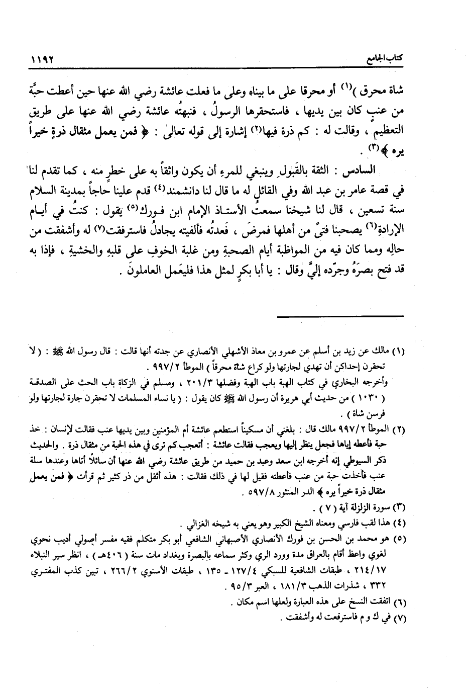 (¬2) الموطأ 2/ 997 مالك قال: بلغني أن مسكيناً استطعم عائشة أم المؤمنين وبين يديها عنب فقالت لإنسان: خذ حبَّة فأعطه إياها فجعل ينظر إليها ويعجب فقالت عائشة: أتعجب كم ترى في هذه الحبة من مثقال ذرة. والحديث ذكر السيوطي إنه أخرجه ابن سعد وعبد بن حميد من طريق عائشة رضي الله عنها أن سائلاً أتاها وعندها سلة عنب فأخذت حبَّة من عنب فأعطته فقيل لها في ذلك فقالت: هذه أثقل من ذر كثير ثم قرأت {فَمَنْ يَعْمَلْ مِثْقَالَ ذَرَّةٍ خَيْرًا يَرَهُ} الدر المنثور 8/ 597.